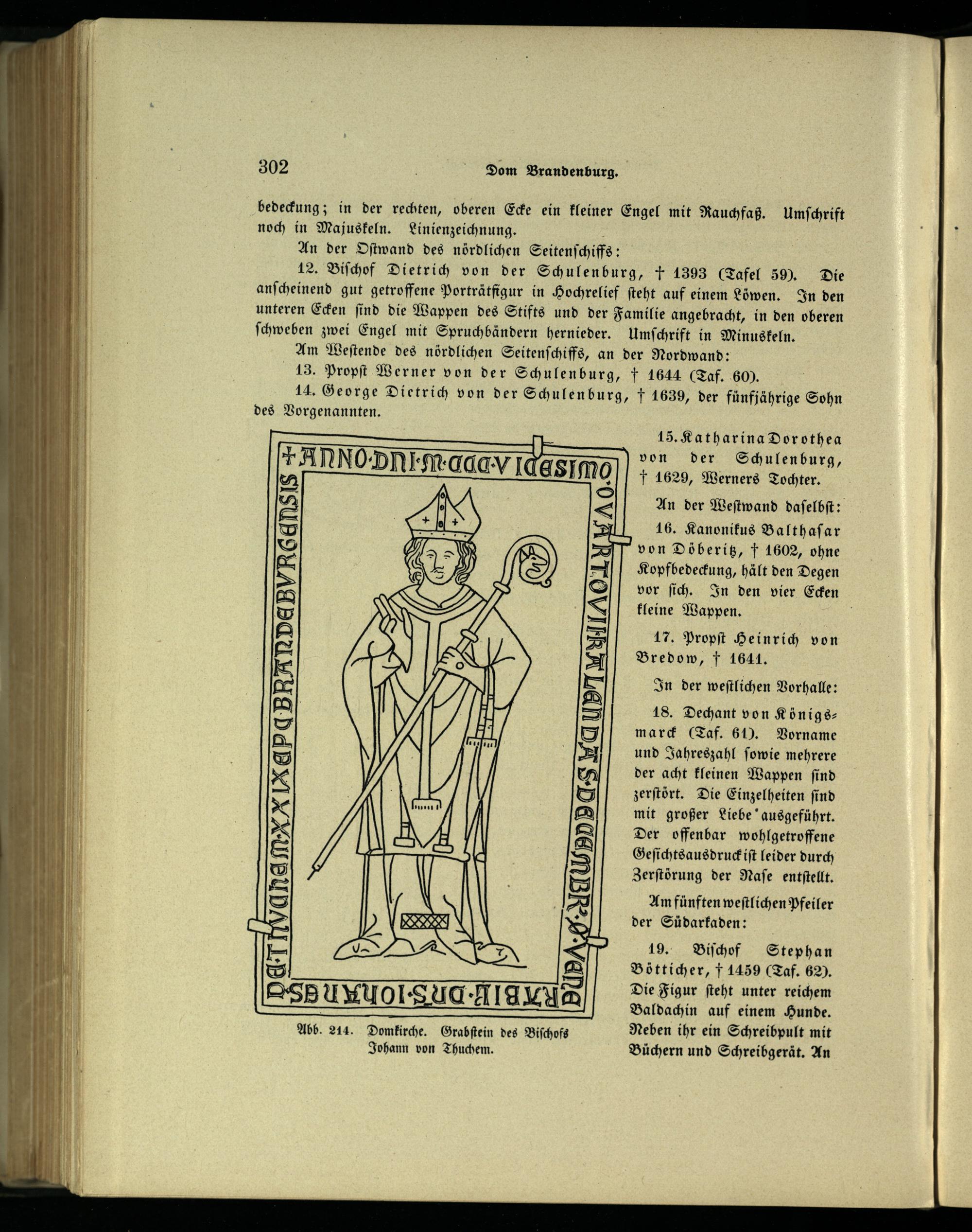 Abb. 214. Domkirche. Grabſtein des Biſchofs Neben ihr ein Schreibpult mit Johann von Thuchem. Büchern und Schreibgerät. An