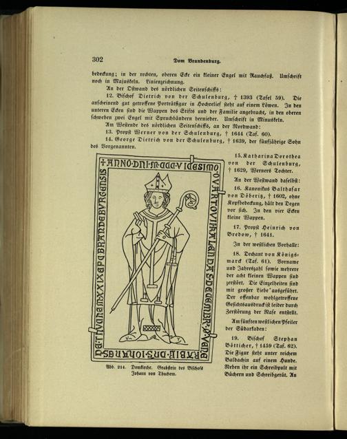 12. Biſchof Dietrich von der Schulenburg, R 1393(Tafel 59). Die anſcheinend gut getroffene Porträtfigur in Hochrelief ſteht auf einem Löwen. In den unteren Ecken ſind die Wappen des Stifts und der Familie angebracht, in den oberen ſchweben zwei Engel mit Spruchbändern hernieder. Umſchrift in Minuskeln.