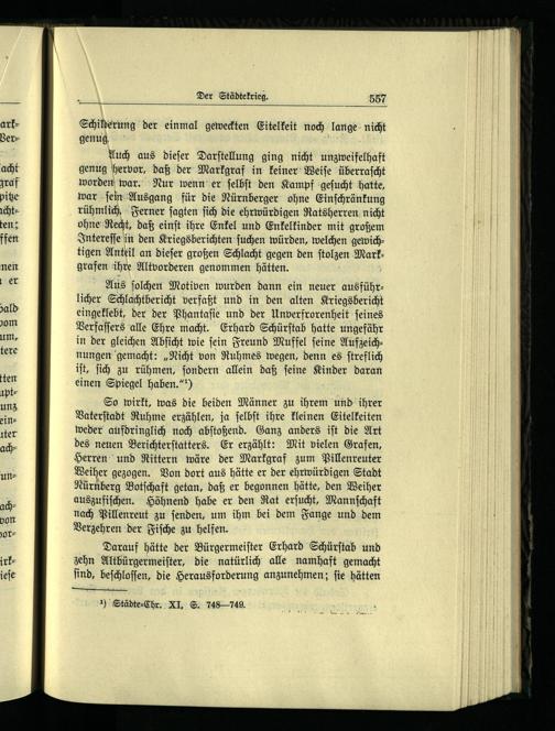 So wirkt, was die beiden Männer zu ihrem und ihrer Vaterſtadt Ruhme erzählen, ja ſelbſt ihre kleinen Eitelkeiten weder aufdringlich noch abſtoßend. Ganz anders iſt die Art des neuen Berichterſtatters. Er erzählt: Mit vielen Grafen, Herren und Rittern wäre der Markgraf zum Pillenreuter Weiher gezogen. Von dort aus hätte er der ehrwürdigen Stadt Nürnberg Botſchaft getan, daß er begonnen hätte, den Weiher auszufiſchen. Höhnend habe er den Rat erſucht, Mannſchaft nach Pillenreut zu ſenden, um ihm bei dem Fange und dem Verzehren der Fiſche zu helfen. 8