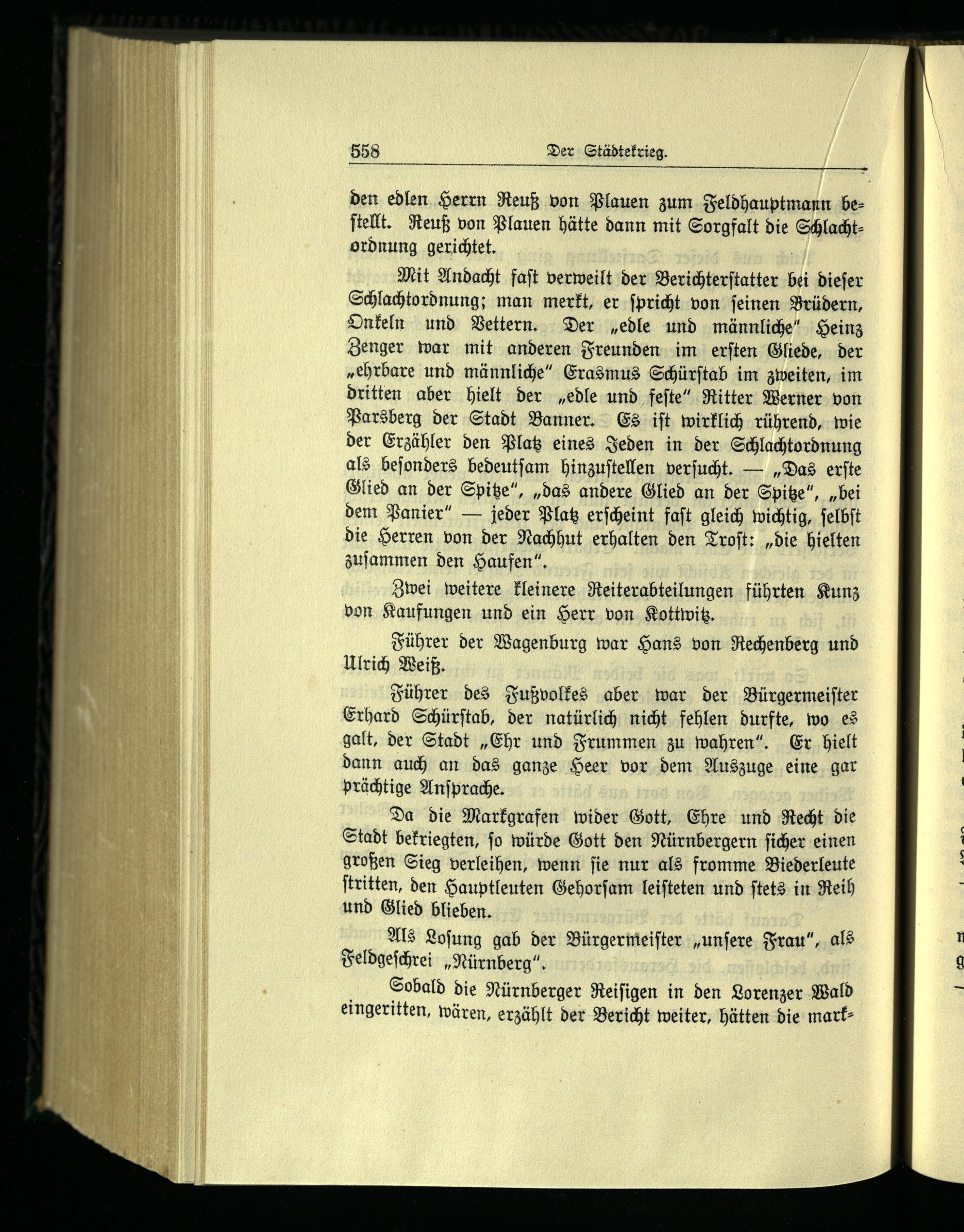 Da die Markgrafen wider Gott, Ehre und Recht die Stadt bekriegten, ſo würde Gott den Nürnbergern ſicher einen großen Sieg verleihen, wenn ſie nur als fromme Biederleute ſtritten, den Hauptleuten Gehorſam leiſteten und ſtets in Reih und Glied blieben.