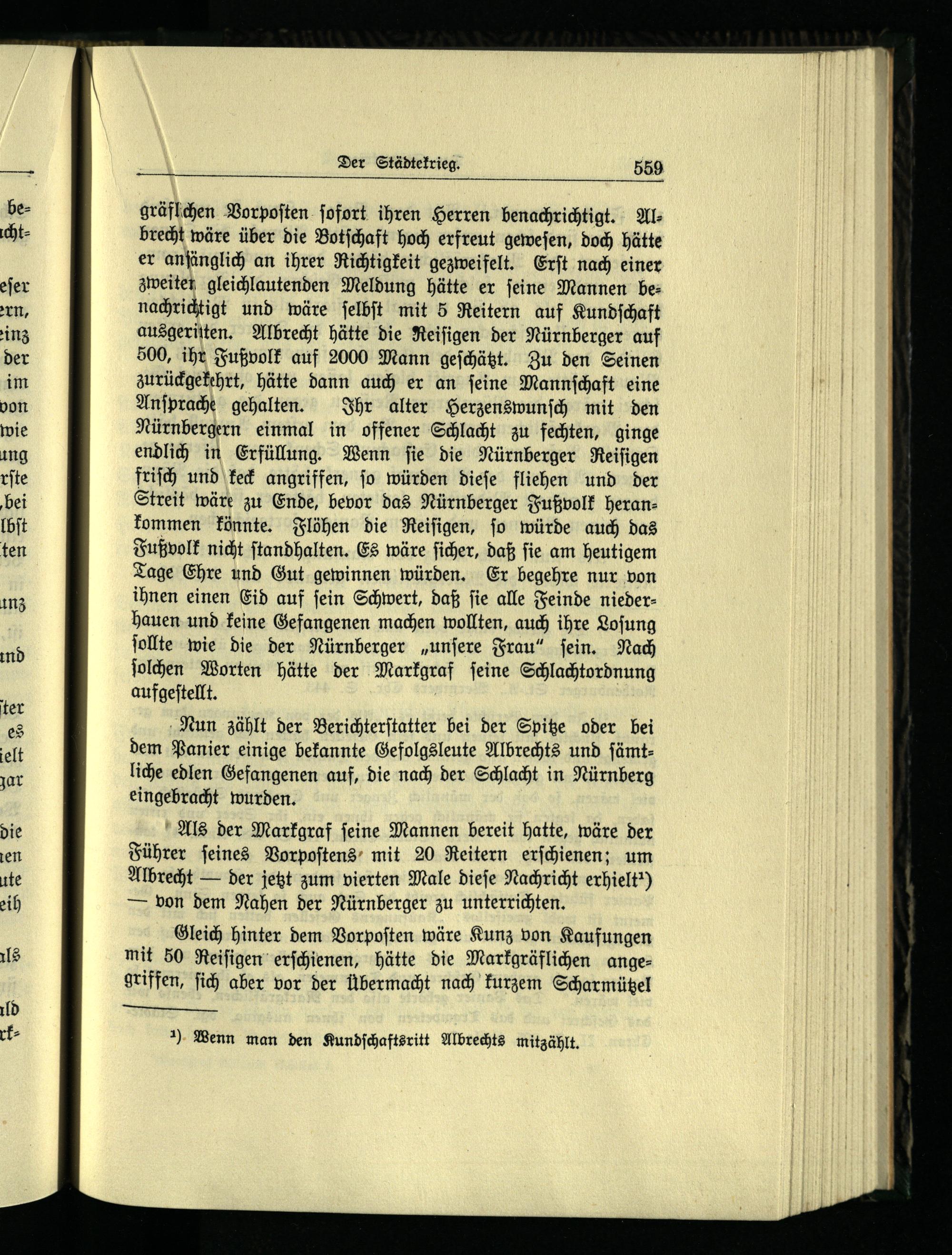 Als der Markgraf ſeine Mannen bereit hatte, wäre der Führer ſeines Vorpoſtens mit 20 Reitern erſchienen; um Albrecht— der jetzt zum vierten Male dieſe Nachricht erhielt“) — von dem Nahen der Nürnberger zu unterrichten.