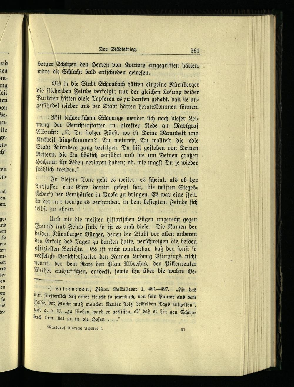 Bis in die Stadt Schwabach hätten einzelne Nüriberger die fliehenden Feinde verfolgt; nur der gleichen Loſung beider Parteien hätten dieſe Tapferen es zu danken gehabt, daß ſie ungefährdet wieder aus der Stadt hätten herauskommen können.