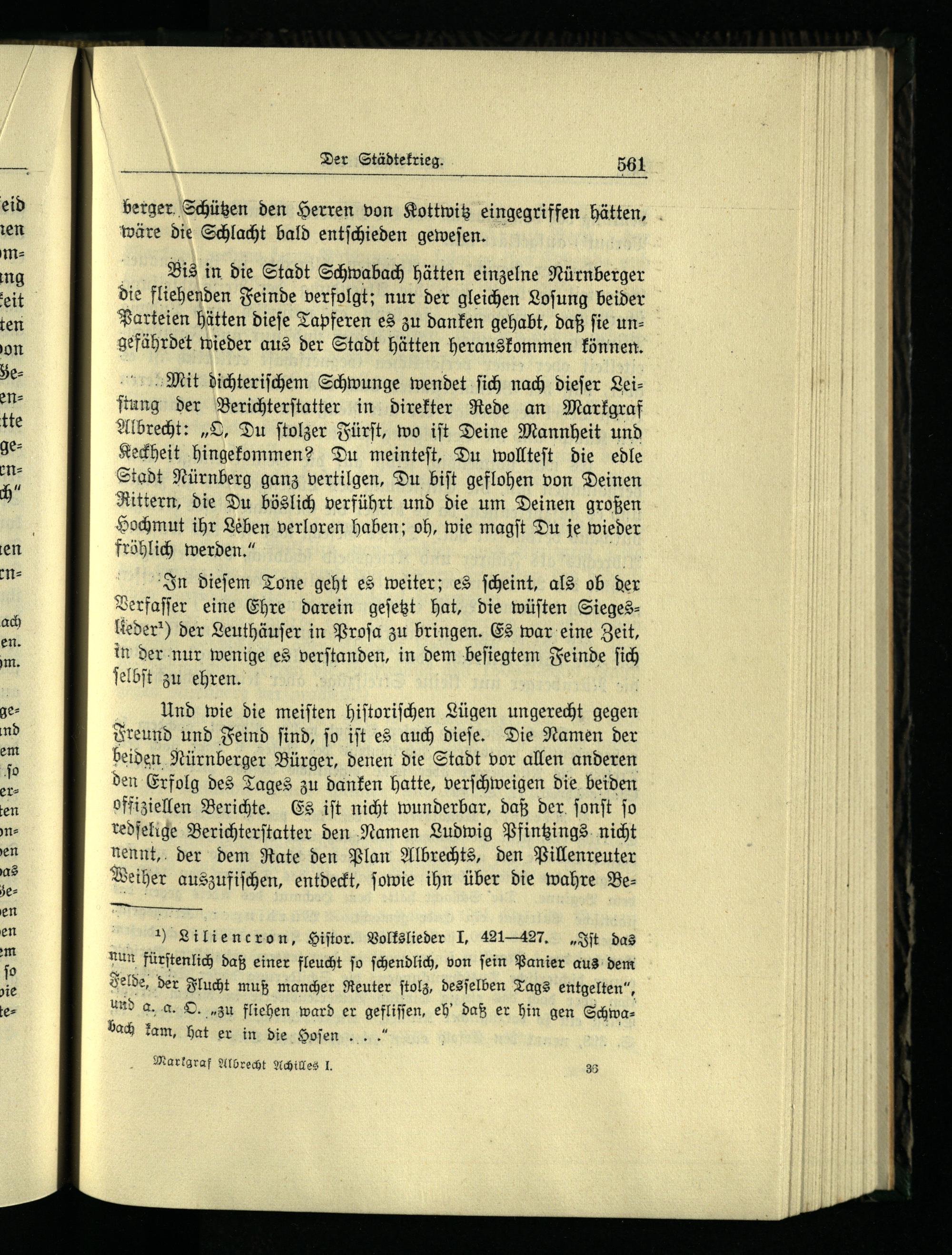 ) Liliencron , Hiſtor. Volkslieder I. 421427.„Iſt das nun fürſtenlich daß einer fleucht ſo ſchendlich, von ſein Panier aus dem Felde, der Flucht muß mancher Reuter ſtolz, desſelben Tags entgelten“; und a. a. O.„zu fliehen ward er gefliſſen, eh' daß er hin gen Schwa bach kam, hat er in die Hoſen