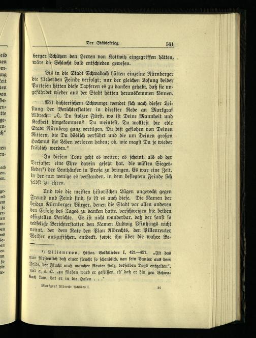 Und wie die meiſten hiſtoriſchen Lügen 1118 gegen Freund und Feind ſind, ſo iſt es auch dieſe. Die Namen der beiden Nürnberger Bürger, denen die Stadt vor allen anderen den E Erfolg des Tages zu danken hatte, verſchweigen die beiden offiziellen Berichte. Es iſt nicht wunderbar, daß der ſonſt ſo redſelige Berichterſtatter den Namen Ludwig Pfintzings nicht nennt, der dem Rate den Plan Albrechts, den Pillenreuter Weiher auszufiſchen, entdeckt, ſowie ihn über die wahre BeA