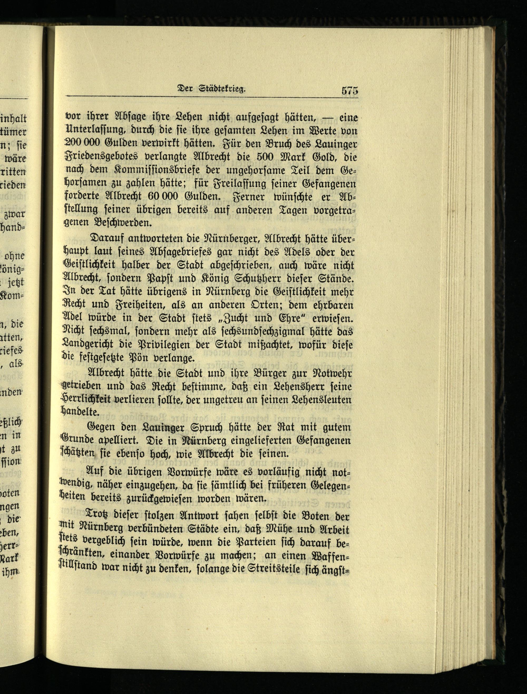 Darauf antworteten die Nürnberger, Albrecht hätte überhaupt laut ſeines Abſagebriefes gar nicht des Adels oder der Geiſtlichkeit halber der Stadt abgeſchrieben, auch wäre nicht Albrecht, ſondern Papſt und König Schutzherr dieſer Stände. In der Tat hätte übrigens in Nürnberg die Geiſtlichkeit mehr Recht und Freiheiten, als an anderen Orten; dem ehrbaren Adel würde in der Stadt ſtets„Zucht und Ehre“ erwieſen. Nicht ſechsmal, ſondern mehr als ſechsundſechzigmal hätte das Landgericht die Privilegien der Stadt mißachtet, wofür dieſe die feſtgeſetzte Pön verlange.
