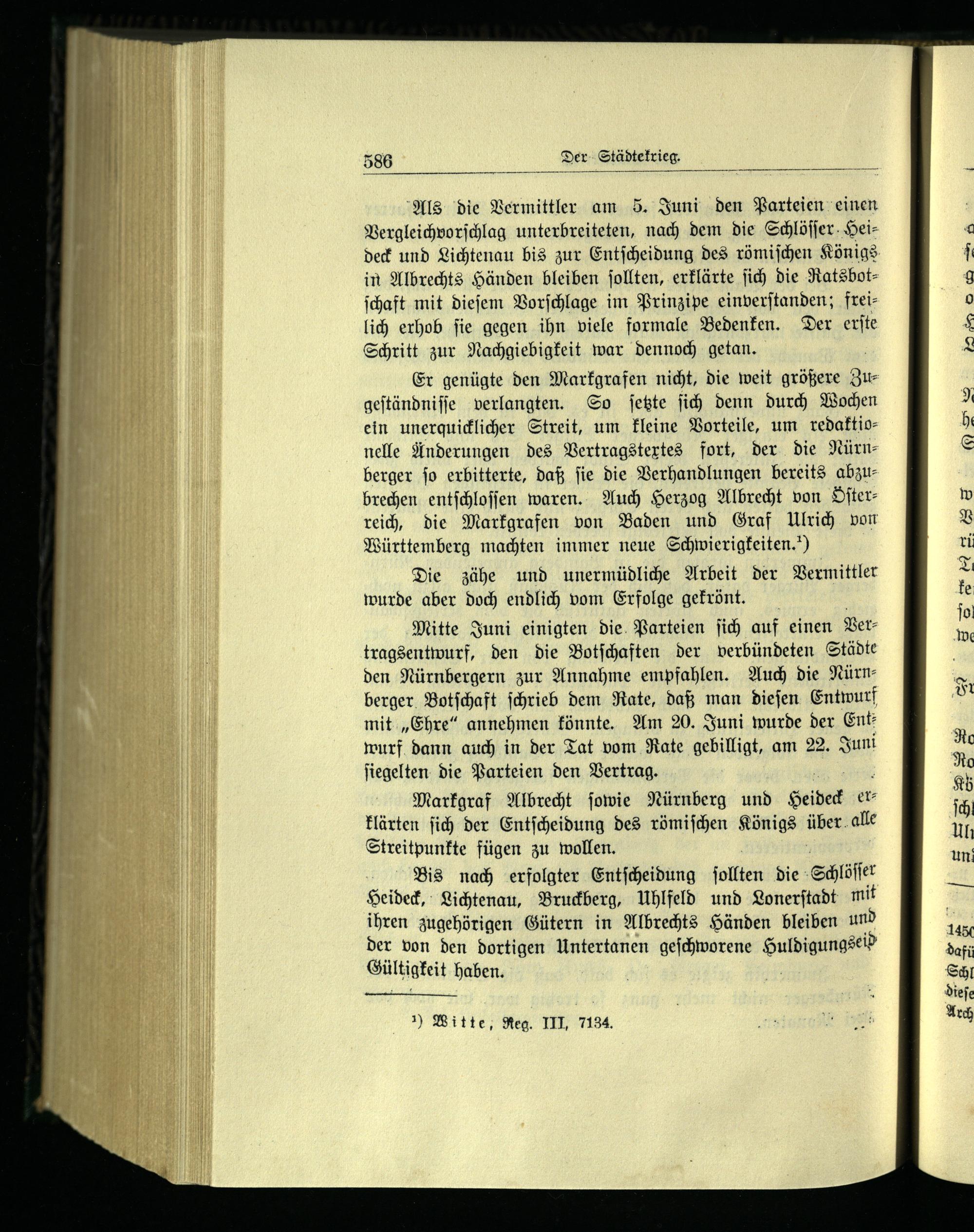 Als die Vermittler am 5. Juni den Parteien einen Vergleichvorſchlag unterbreiteten, nach dem die Schlöſſer Hei deck und Lichtenau bis zur Entſcheidung des römiſchen Königs. in Albrechts Händen bleiben ſollten, erklärte ſich die Ratsbotſchaft mit dieſem Vorſchlage im Prinzipe einverſtanden; freilich erhob ſie gegen ihn viele formale Bedenken. Der erſte Schritt zur Nachgiebigkeit war dennoch getan.