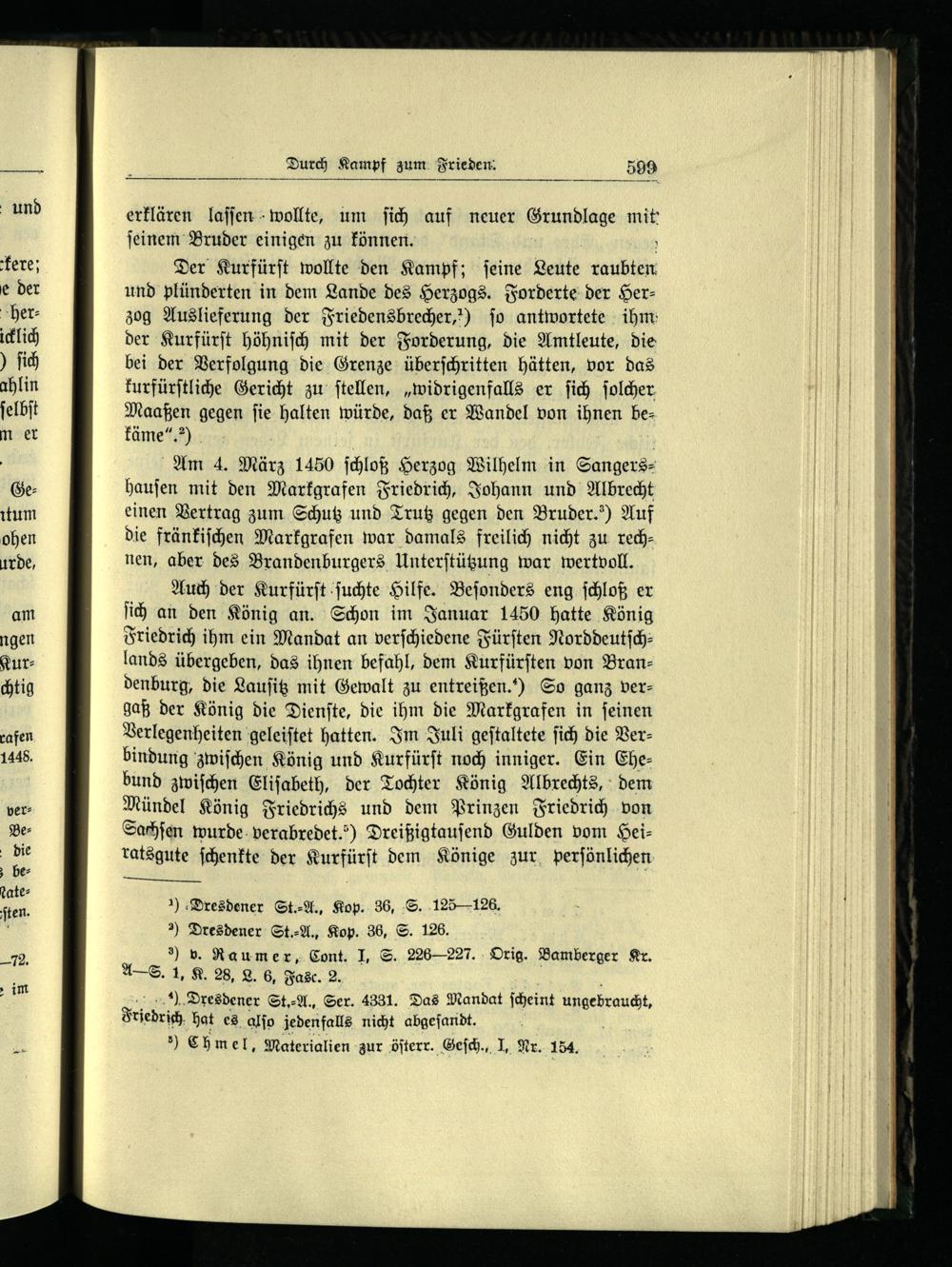 Am 4. März 1450 ſchloß Herzog Wilhelm in Sangers hauſen mit den Markgrafen Friedrich, Johann und Albrecht einen Vertrag zum Schutz und Trutz gegen den Bruder.“) Auf die fränkiſchen Markgrafen war damals freilich nicht zu rechnen, aber des Brandenburgers Unterſtützung war wertvoll.