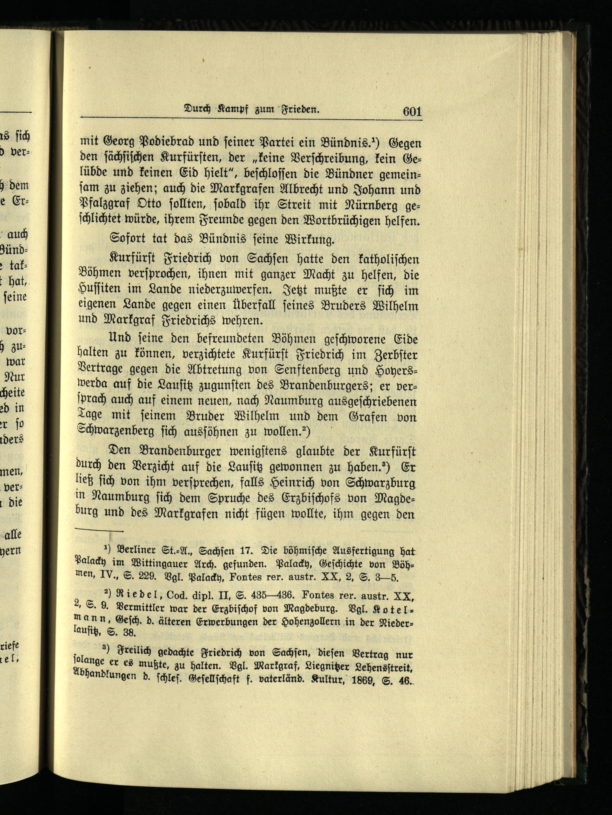 Und ſeine den befreundeten Böhmen geſchworene Eide halten zu können, verzichtete Kurfürſt Friedrich im Zerbſter Vertrage gegen die Abtretung von Senftenberg und Hoyers werda auf die Lauſitz zugunſten des Brandenburgers; er verſprach auch auf einem neuen, nach Naumburg ausgeſchriebenen