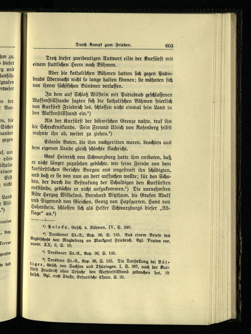 Als der Kurfürſt der böhmiſchen Grenze nahte, traf ihn die Schreckenskunde. Sein Freund Ulrich von Roſenberg ſelbſt mahnte ihn ab, weiter zu ziehen.“)