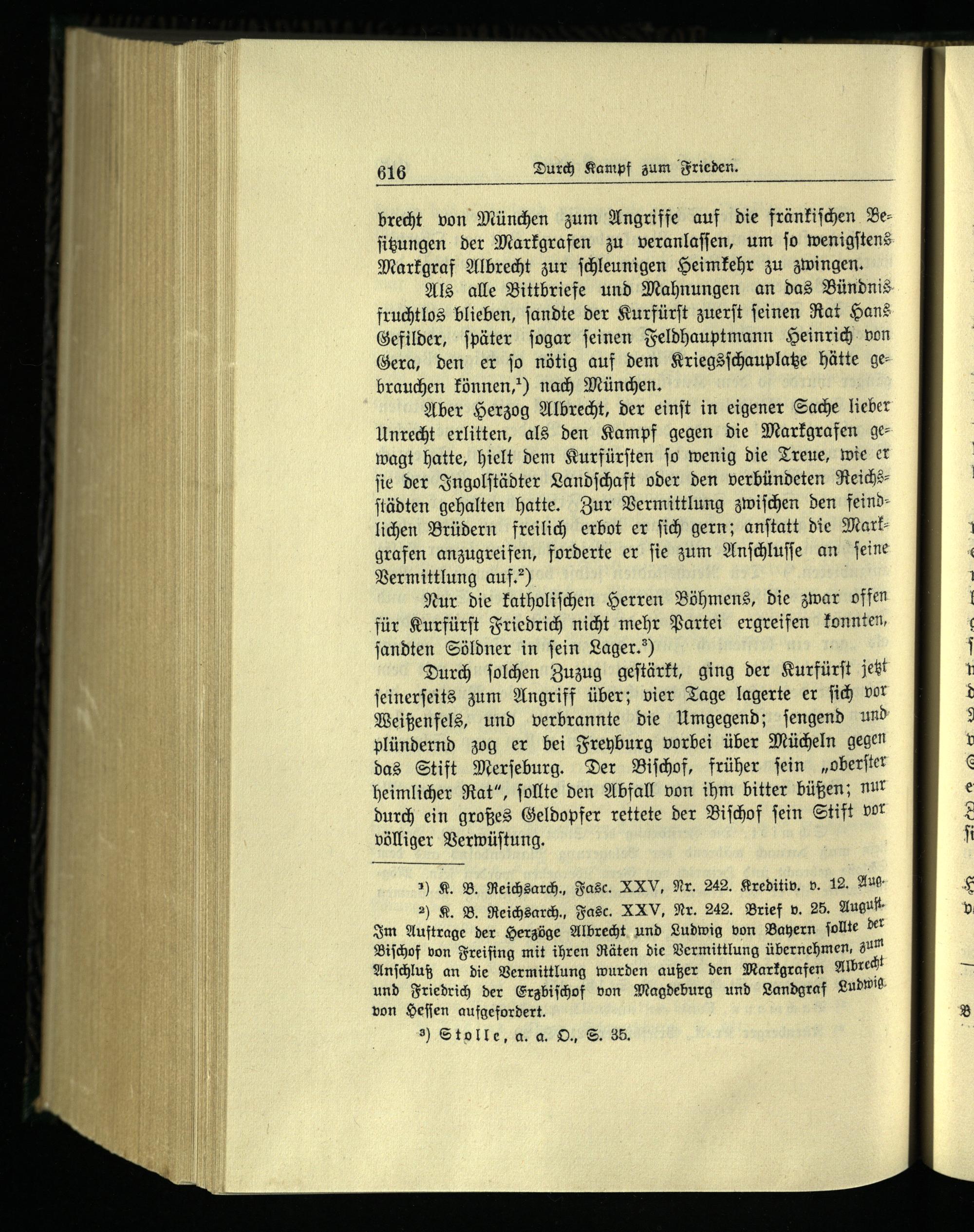 Durch ſolchen Zuzug geſtärkt, ging der Kurfürſt jetzt ſeinerſeits zum Angriff über; vier Tage lagerte er ſich vor Weißenfels , und verbrannte die Umgegend; ſengend und plündernd zog er bei Freyburg vorbei über Mücheln gegen das Stift Merſeburg . Der Biſchof, früher ſein„oberſter heimlicher Rat“, ſollte den Abfall von ihm bitter büßen; nur durch ein großes Geldopfer rettete der Biſchof ſein Stift vor völliger Verwüſtung.