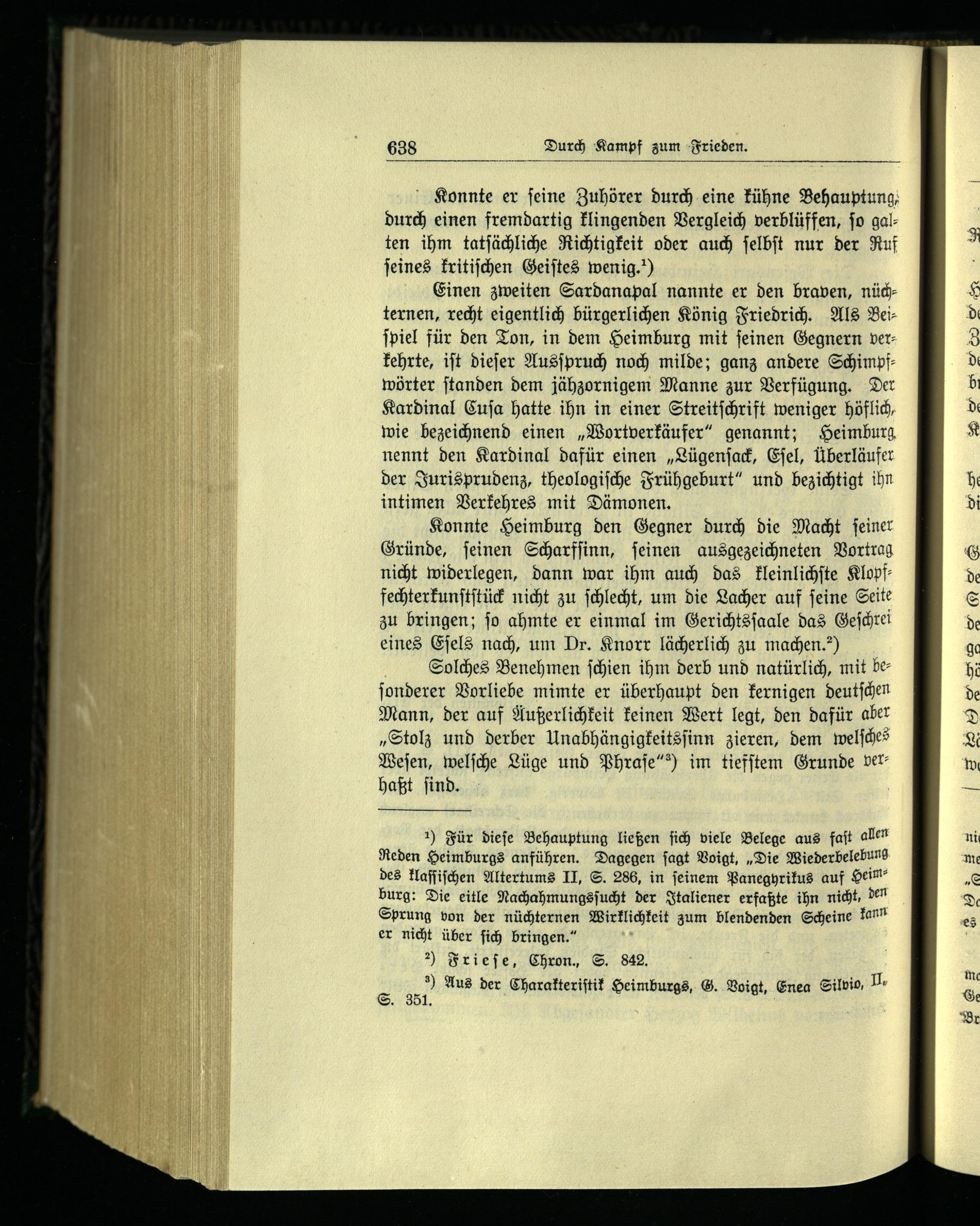 Einen zweiten Sardanapal nannte er den braven, nüchternen, recht eigentlich bürgerlichen König Friedrich. Als Beiſpiel für den Ton, in dem Heimburg mit ſeinen Gegnern verkehrte, iſt dieſer Ausſpruch noch milde; ganz andere Schimpfwörter ſtanden dem jähzornigem Manne zur Verfügung. Der Kardinal Cuſa hatte ihn in einer Streitſchrift weniger höflich, wie bezeichnend einen„Wortverkäufer“ genannt; Heimburg , nennt den Kardinal dafür einen„Lügenſack, Eſel, Überläufer der Jurisprudenz, theologiſche Frühgeburt“ und bezichtigt ihn intimen Verkehres mit Dämonen.