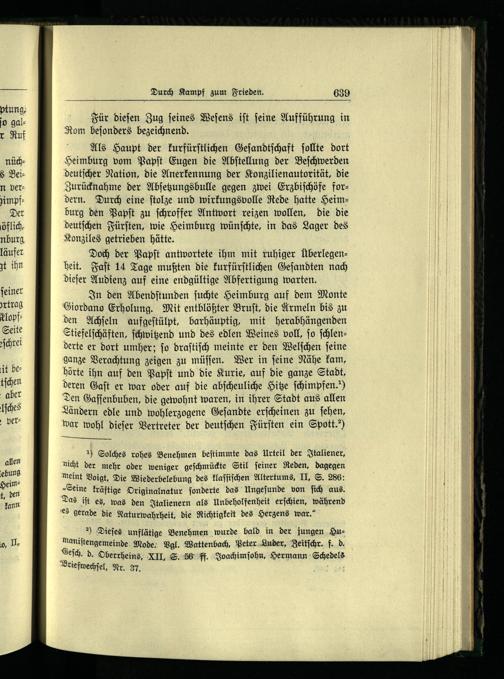 In den Abendſtunden ſuchte Heimburg auf dem Monte Giordano Erholung. Mit entblößter Bruſt, die Armeln bis zu den Achſeln aufgeſtülpt, barhäuptig, mit herabhängenden Stiefelſchäften, ſchwitzend und des edlen Weines voll, ſo ſchlenderte er dort umher; ſo draſtiſch meinte er den Welſchen ſeine ganze Verachtung zeigen zu müſſen. Wer in ſeine Nähe kam, hörte ihn auf den Papſt und die Kurie, auf die ganze Stadt, deren Gaſt er war oder auf die abſcheuliche Hitze ſchimpfen.“) Den Gaſſenbuben, die gewohnt waren, in ihrer Stadt aus allen Ländern edle und wohlerzogene Geſandte erſcheinen zu ſehen, war wohl dieſer Vertreter der deutſchen Fürſten ein Spott.“)