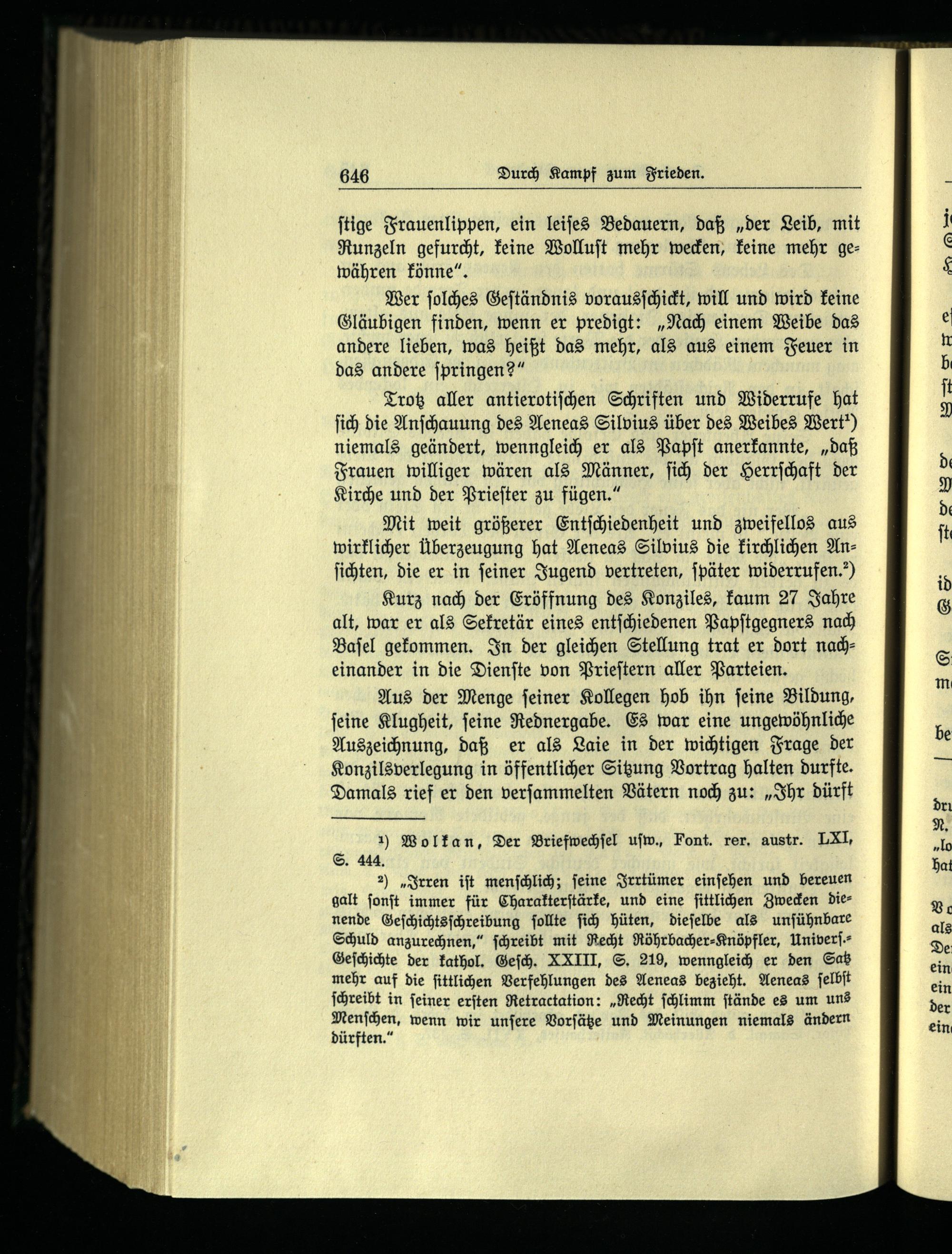 Mit weit größerer Entſchiedenheit und zweifellos aus wirklicher Überzeugung hat Aeneas Silvius die kirchlichen Anſichten, die er in ſeiner Jugend vertreten, ſpäter widerrufen.“)