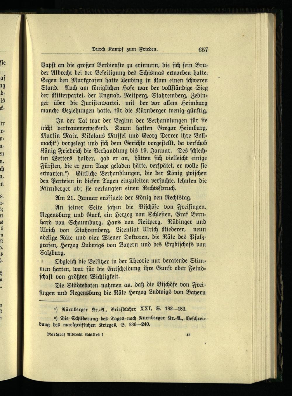 In der Tat war der Beginn der Verhandlungen für ſie nicht vertrauenerweckend. Kaum hatten Gregor Heimburg , Martin Mair, Nikolaus Muffel und Georg Derrer ihre Vollmacht“) vorgelegt und ſich dem Gerichte vorgeſtellt, da verſchob König Friedrich die Verhandlung bis 19. Januar. Des ſchlechten Wetters halber, gab er an, hätten ſich vielleicht einige Fürſten , die er zum Tage geladen hätte, verſpätet, er wolle ſie erwarten.?) Gütliche Verhandlungen, die der König zwiſchen den Parteien in dieſen Tagen einzuleiten verſuchte, lehnten die Nürnberger ab; ſie verlangten einen Rechtsſpruch.