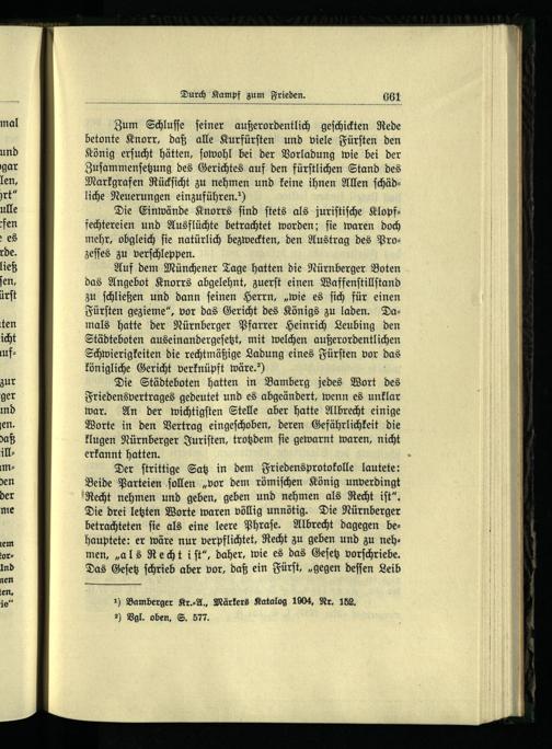 Auf dem Münchener Tage hatten die Nürnberger Boten das Angebot Knorrs abgelehnt, zuerſt einen Waffenſtillſtand zu ſchließen und dann ſeinen Herrn,„wie es ſich für einen Fürſten gezieme“, vor das Gericht des Königs zu laden. Damals hatte der Nürnberger Pfarrer Heinrich Leubing den Städteboten auseinandergeſetzt, mit welchen außerordentlichen Schwierigkeiten die rechtmäßige Ladung eines Fürſten vor Das königliche Gericht verknüpft wäre.“)