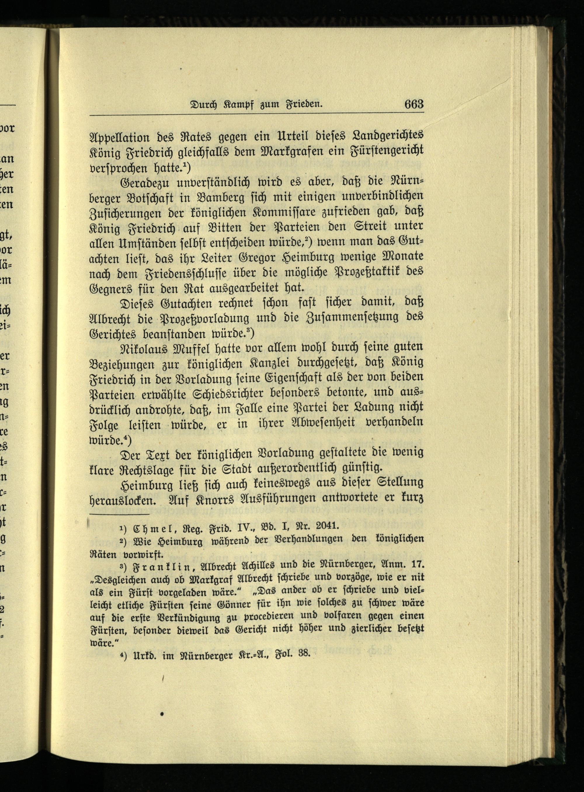 Geradezu unverſtändlich wird es aber, daß die Nürn berger Botſchaft in Bamberg ſich mit einigen unverbindlichen Zuſicherungen der königlichen Kommiſſare zufrieden gab, daß König Friedrich auf Bitten der Parteien den Streit unter allen Umſtänden ſelbſt entſcheiden würde,) wenn man das Gutachten lieſt, das ihr Leiter Gregor Heimburg wenige Monate nach dem Friedensſchluſſe über die mögliche Prozeßtaktik des Gegners für den Rat ausgearbeitet hat.