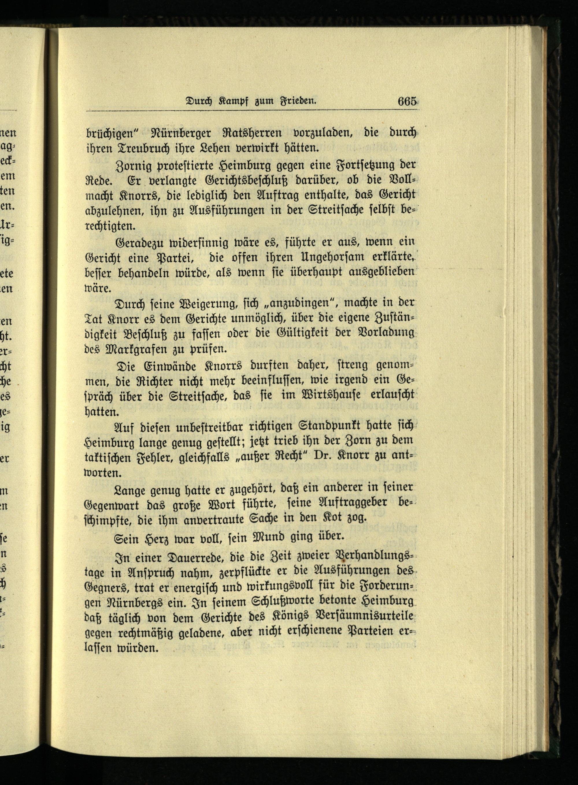 In einer Dauerrede, die die Zeit zweier Verhandlungstage in Anſpruch nahm, zerpflückte er die Ausführungen des Gegners, trat er energiſch und wirkungsvoll für die Forderungen Nürnbergs ein. In ſeinem Schlußworte betonte Heimburg daß täglich von dem Gerichte des Königs Verſäumnisurteile gegen rechtmäßig geladene, aber nicht erſchienene Parteien erlaſſen würden.