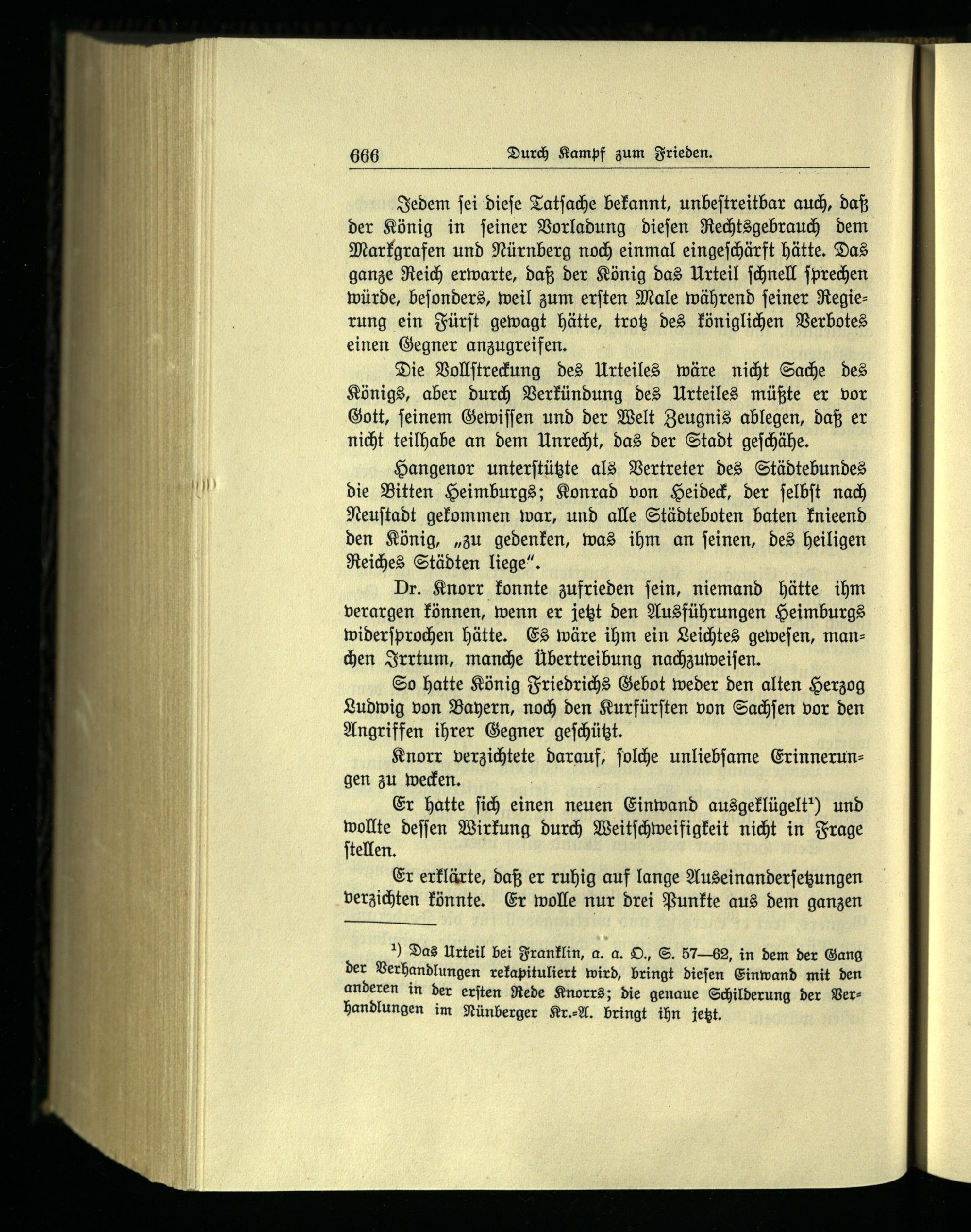 Jedem ſei dieſe Tatſache bekannt, unbeſtreitbar auch, daß der König in ſeiner Vorladung dieſen Rechtsgebrauch dem Markgrafen und Nürnberg noch einmal eingeſchärft hätte. Das ganze Reich erwarte, daß der König das Urteil ſchnell ſprechen würde, beſonders, weil zum erſten Male während ſeiner Regierung ein Fürſt gewagt hätte, trotz des königlichen Verbotes einen Gegner anzugreifen.