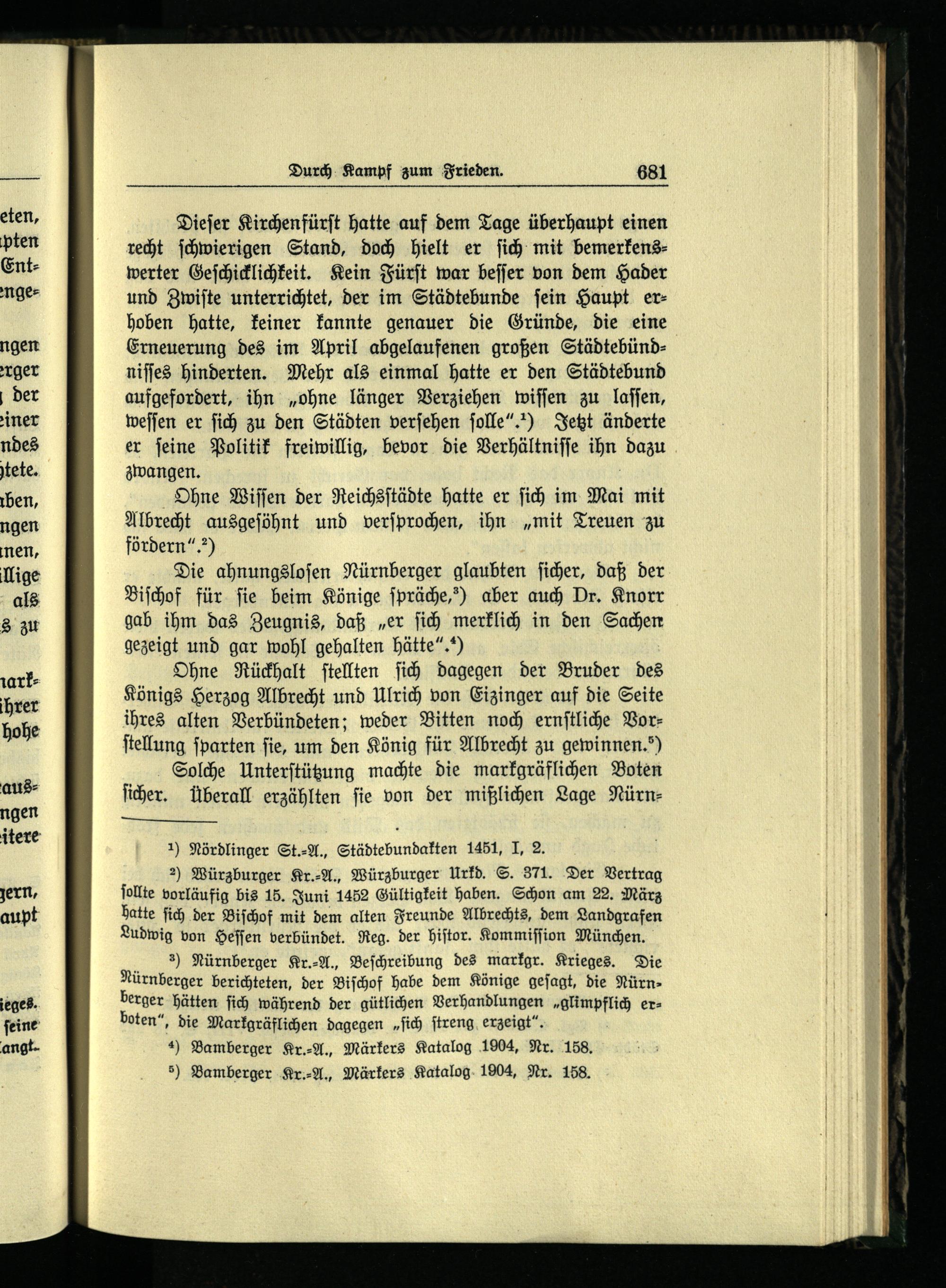 3) Nürnberger Kr.⸗A., Beſchreibung des markgr. Krieges. Die Nürnberger berichteten, der Biſchof habe dem Könige geſagt, die Nürn berger hätten ſich während der gütlichen Verhandlungen„glimpflich erboten“, die Markgräflichen dagegen„ſich ſtreng erzeigt“.