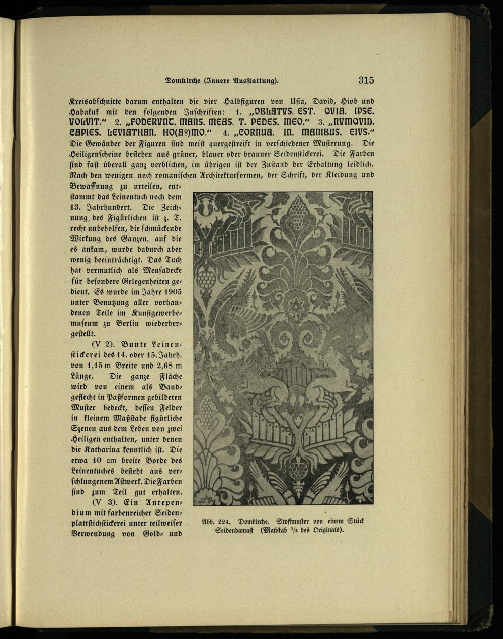plattſtichſtickerei unter teilweiſer Abb. 224. Domkirche. Stoffmuſter von einem Stück Verwendung von Gold- und Seidendamaſt(Maßſtab n /3 des Originals).