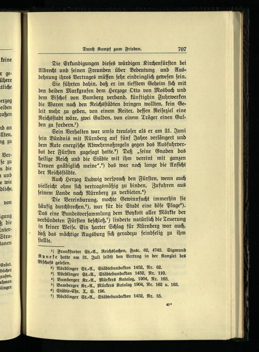 Sie führten dahin, daß er im tiefſtem Geheim ſich mit den beiden Markgrafen dem Herzoge Otto von Mosbach und dem Biſchof von Bamberg verband, künftighin Fuhrwerken die Waren nach den Reichsſtädten bringen wollten, kein Geleit mehr zu geben, von einem Reiter, deſſen Reiſeziel eine Reichsſtadt wäre, zwei Gulden, von einem Träger einen Gulden zu fordern.“)