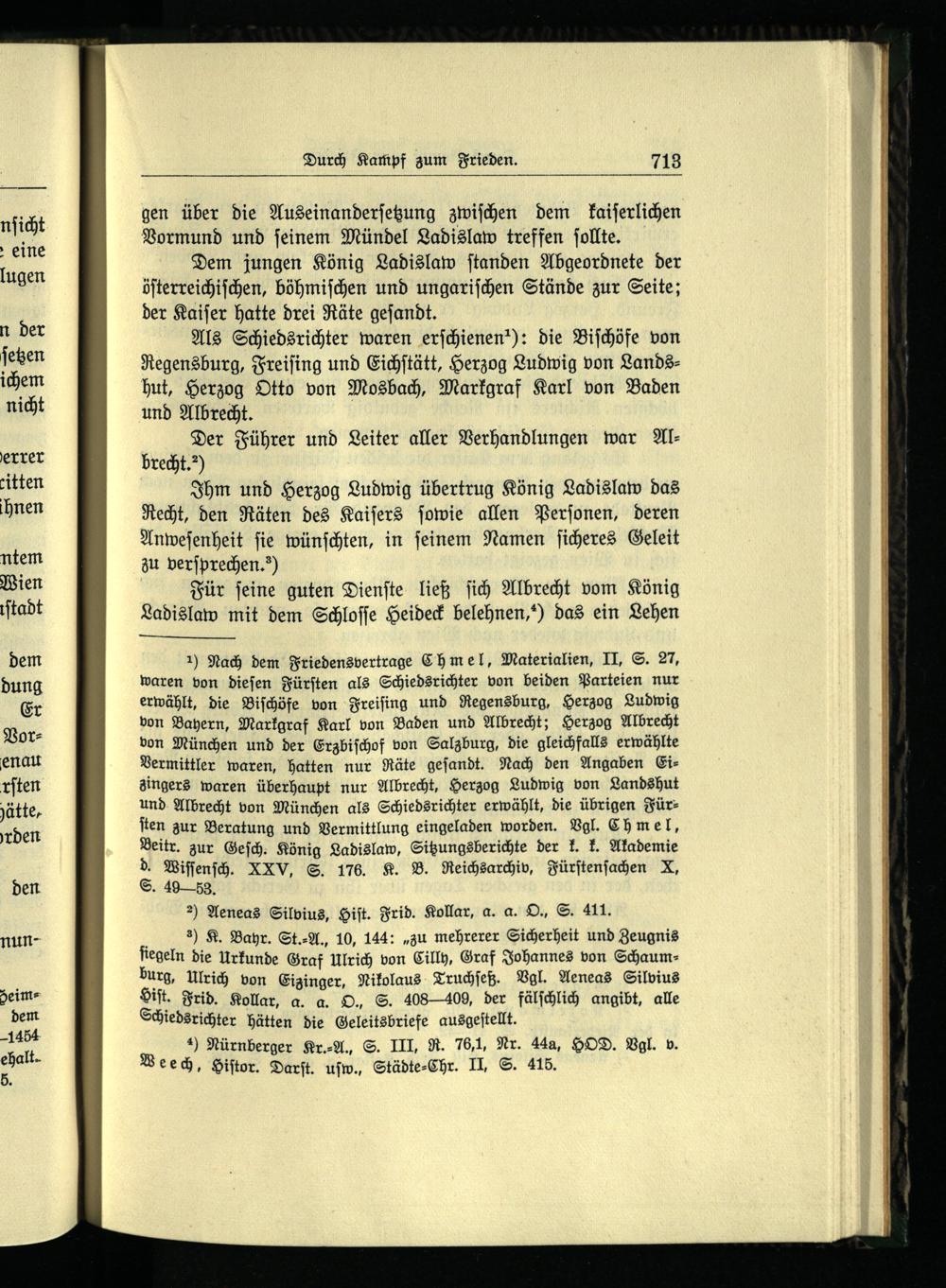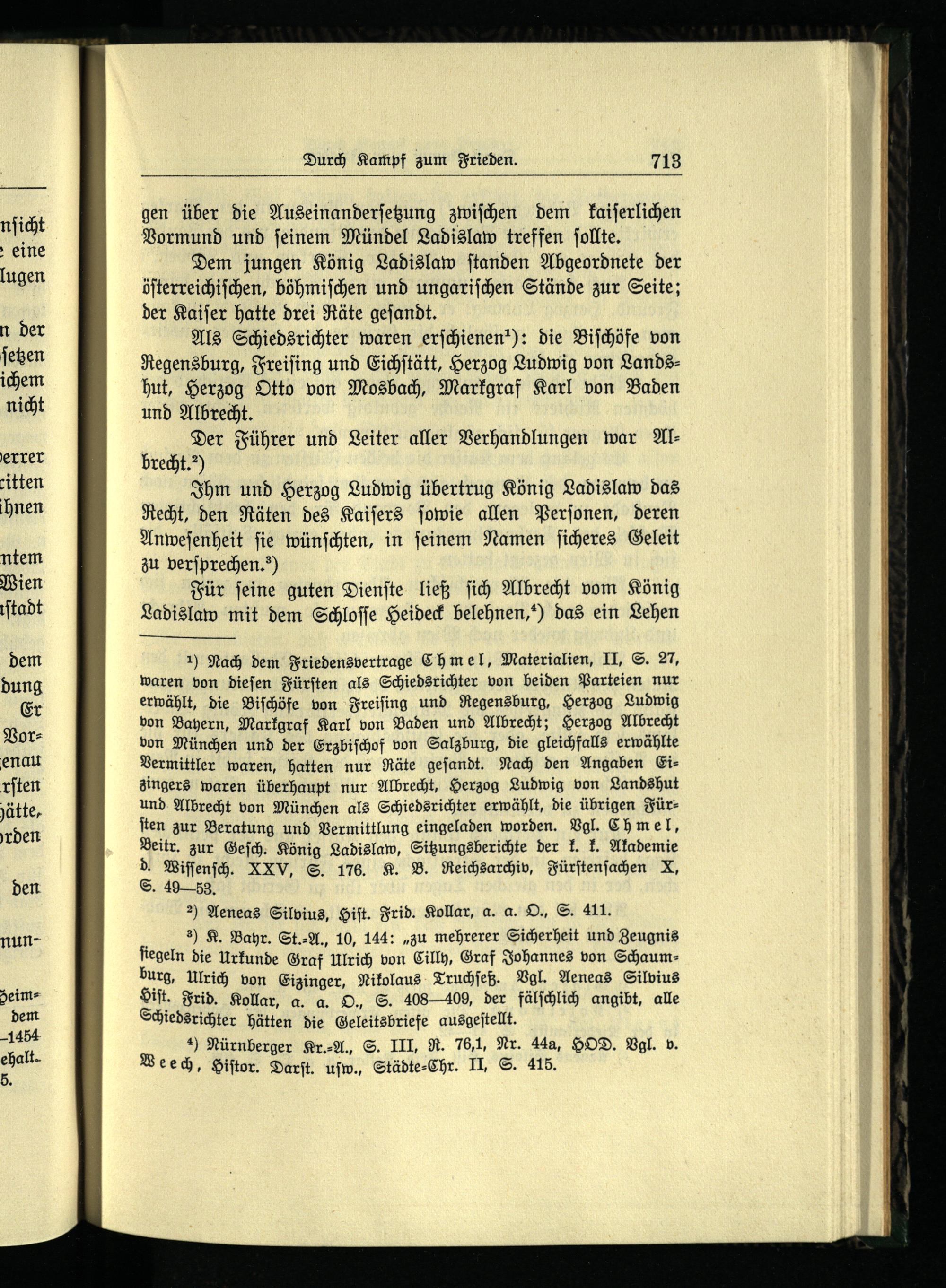 1) Nach dem Friedensvertrage Chmel, Materialien, II, S. 27, waren von dieſen Fürſten als Schiedsrichter von beiden Parteien nur erwählt, die Biſchöfe von Freiſing und Regensburg , Herzog Ludwig von Bayern, Markgraf Karl von Baden und Albrecht; Herzog Albrecht von München und der Erzbiſchof von Salzburg , die gleichfalls erwählte Vermittler waren, hatten nur Räte geſandt. Nach den Angaben Eizingers waren überhaupt nur Albrecht, Herzog Ludwig von Landshut und Albrecht von München als Schiedsrichter erwählt, die übrigen Fürſten zur Beratung und Vermittlung eingeladen worden. Vgl. Chmel, Beitr. zur Geſch. König Ladislaw, Sitzungsberichte der k. k. Akademie d. Wiſſenſch. XXV, S. 176. K. B. Reichsarchiv, Fürſtenſachen X, S. 49—53.