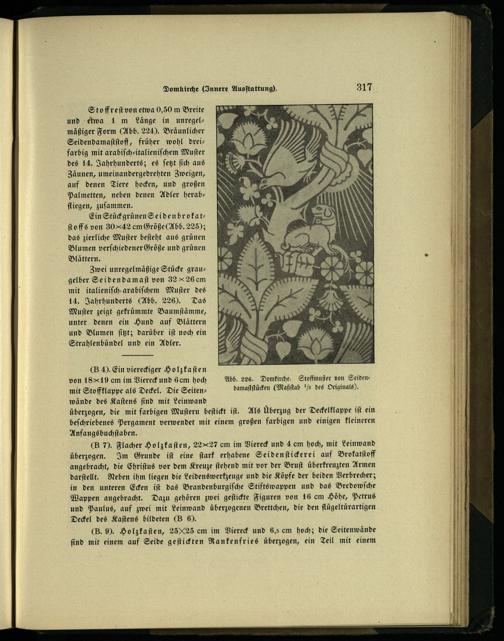 Stoff reſt von etwa 0, 50 m Breite und etwa 1 m Länge in unregel— mäßiger Form(Abb. 224). Bräunlicher Seidendamaſtſtoff, früher wohl dreifarbig mit arabiſch⸗italieniſchem Muſter des 14. Jahrhunderts; es ſetzt ſich aus Zäunen, umeinandergedrehten Zweigen, auf denen Tiere hocken, und großen Palmetten, neben denen Adler herabfliegen, zuſammen.