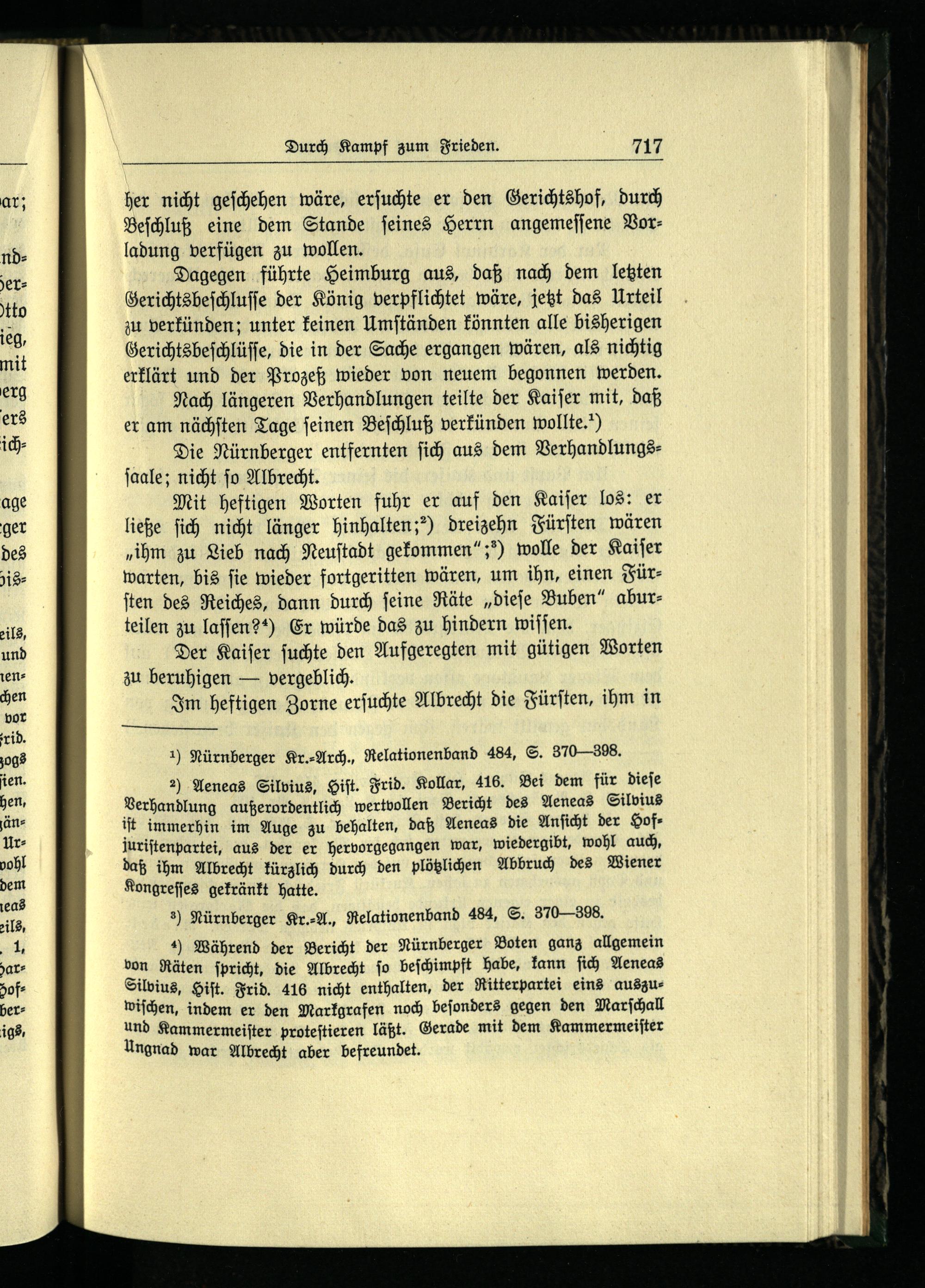 ) Während der Bericht der Nürnberger Boten ganz allgemein von Räten ſpricht, die Albrecht ſo beſchimpft habe, kann ſich Aeneas Silvius, Hiſt. Frid. 416 nicht enthalten, der Ritterpartei eins auszuwiſchen, indem er den Markgrafen noch beſonders gegen den Marſchall und Kammermeiſter proteſtieren läßt. Gerade mit dem Kammermeiſter Ungnad war Albrecht aber befreundet.