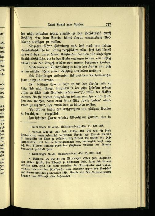 2) Aeneas Silvius, Gift. Frid. Kollar, 416. Bei dem für dieſe Verhandlung außerordentlich wertvollen Bericht des Aeneas Silvius iſt immerhin im Auge zu behalten, daß Aeneas die Anſicht der Hofjuriſtenpartei, aus der er hervorgegangen war, wiedergibt, wohl auch, daß ihm Albrecht kürzlich durch den plötzlichen Abbruch des Wiener Kongreſſes gekränkt hatte.