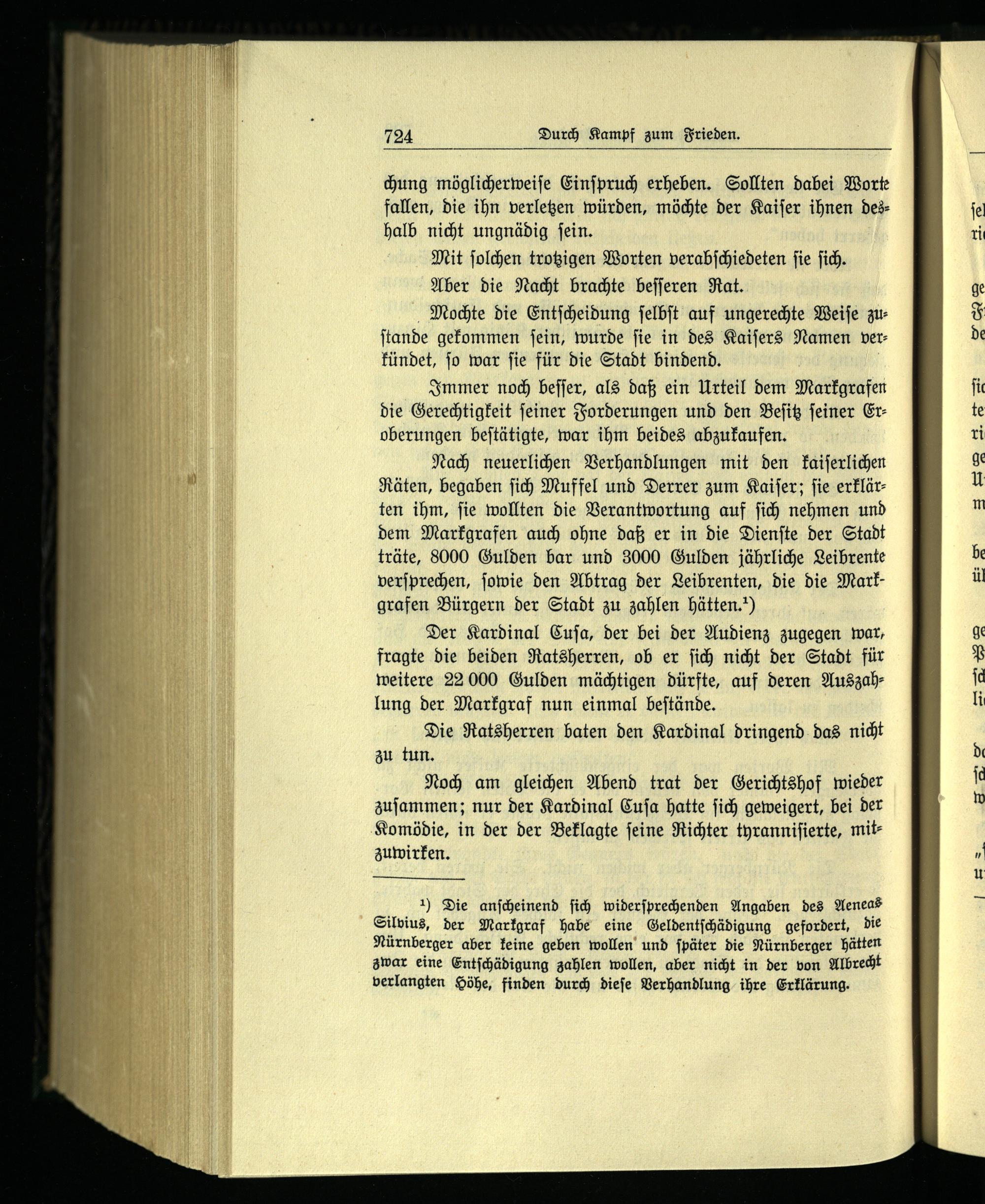 1) Die anſcheinend ſich widerſprechenden Angaben des Aeneas Silvius, der Markgraf habe eine Geldentſchädigung gefordert, die Nürnberger aber keine geben wollen und ſpäter die Nürnberger hätten zwar eine Entſchädigung zahlen wollen, aber nicht in der von Albrecht verlangten Höhe, finden durch dieſe Verhandlung ihre Erklärung.
