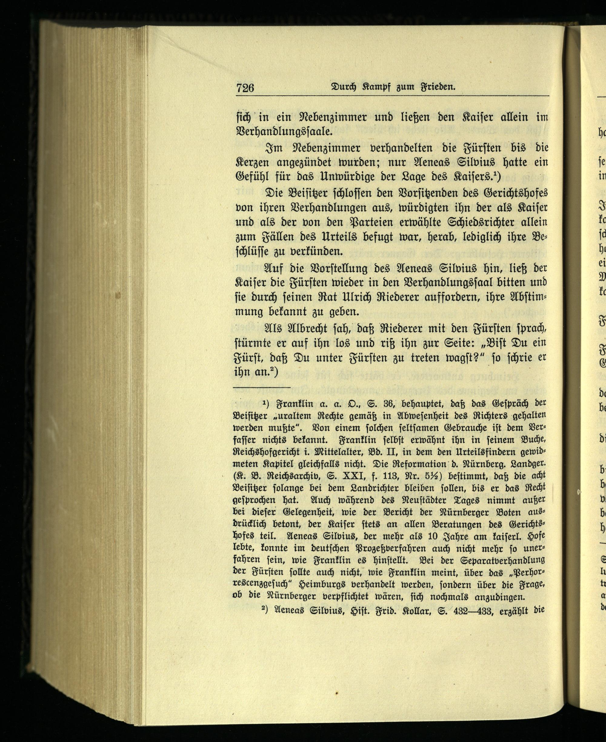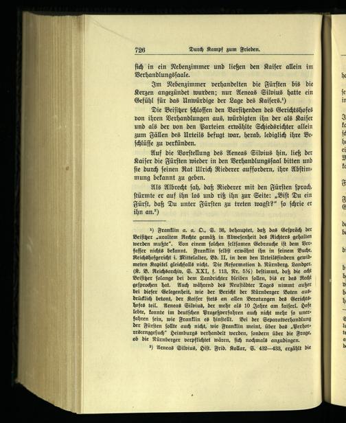 Im Nebenzimmer verhandelten die Fürſten bis die Kerzen angezündet wurden; nur Aeneas Silvius hatte ein Gefühl für das Unwürdige der Lage des Kaiſers.“)