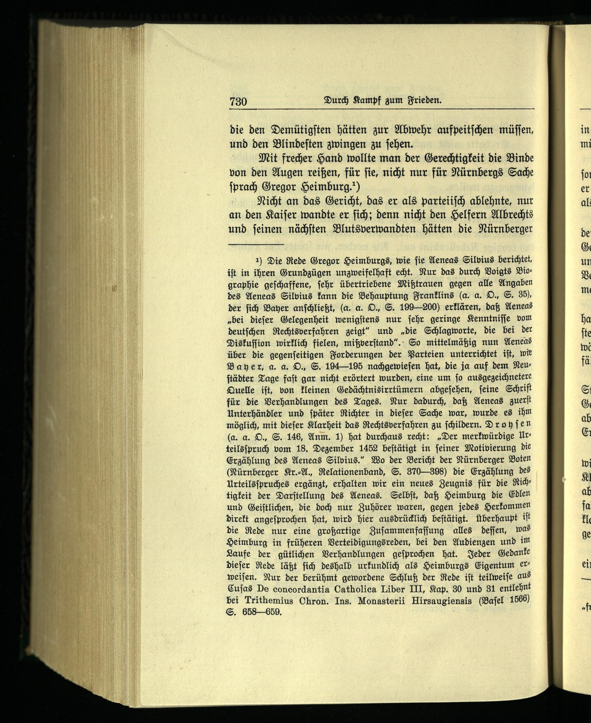 1) Die Rede Gregor Heimburgs, wie ſie Aeneas Silvius berichtet, iſt in ihren Grundzügen unzweifelhaft echt. Nur das durch Voigts Biographie geſchaffene, ſehr übertriebene Mißtrauen gegen alle Angaben des Aeneas Silvius kann die Behauptung Franklins(a. a. O., S. 35), der ſich Bayer anſchließt,(a. a. O., S. 199—200) erklären, daß Aeneas „bei dieſer Gelegenheit wenigſtens nur ſehr geringe Kenntniſſe vom deutſchen Rechtsverfahren zeigt“ und„die Schlagworte, die bei der Diskuſſion wirklich fielen, mißverſtand“. So mittelmäßig nun Aeneas über die gegenſeitigen Forderungen der Parteien unterrichtet iſt, wir Bayer, a. a. O., S. 194—195 nachgewieſen hat, die ja auf dem Neuſtädter Tage faſt gar nicht erörtert wurden, eine um ſo ausgezeichnetere Quelle iſt, von kleinen Gedächtnisirrtümern abgeſehen, ſeine Schrift für die Verhandlungen des Tages. Nur dadurch, daß Aeneas zuerſt Unterhändler und ſpäter Richter in dieſer Sache war, wurde es ihm möglich, mit dieſer Klarheit das Rechtsverfahren zu ſchildern. Droyſen (a. a. O., S. 146, Anm. 1) hat durchaus recht:„Der merkwürdige Urteilsſpruch vom 18. Dezember 1452 beſtätigt in ſeiner Motivierung die Erzählung des Aeneas Silvius.“ Wo der Bericht der Nürnberger Boten (Nürnberger Kr.⸗A., Relationenband, S. 370—398) die Erzählung des Urteilsſpruches ergänzt, erhalten wir ein neues Zeugnis für die Richtigkeit der Darſtellung des Aeneas . Selbſt, daß Heimburg die Edlen und Geiſtlichen, die doch nur Zuhörer waren, gegen jedes Herkommen direkt angeſprochen hat, wird hier ausdrücklich beſtätigt. Überhaupt iſt die Rede nur eine großartige Zuſammenfaſſung alles deſſen, was Heimburg in früheren Verteidigungsreden, bei den Audienzen und im Laufe der gütlichen Verhandlungen geſprochen hat. Jeder Gedanke dieſer Rede läßt ſich deshalb urkundlich als Heimburgs Eigentum erweiſen. Nur der berühmt gewordene Schluß der Rede iſt teilweiſe aus Cuſas De concordantia Catholica Liber III, Kap. 30 und 31 entlehnt bei Trithemius Chron. Ins. Monasterii Hirsaugiensis(Baſel 1566) S. 658659.
