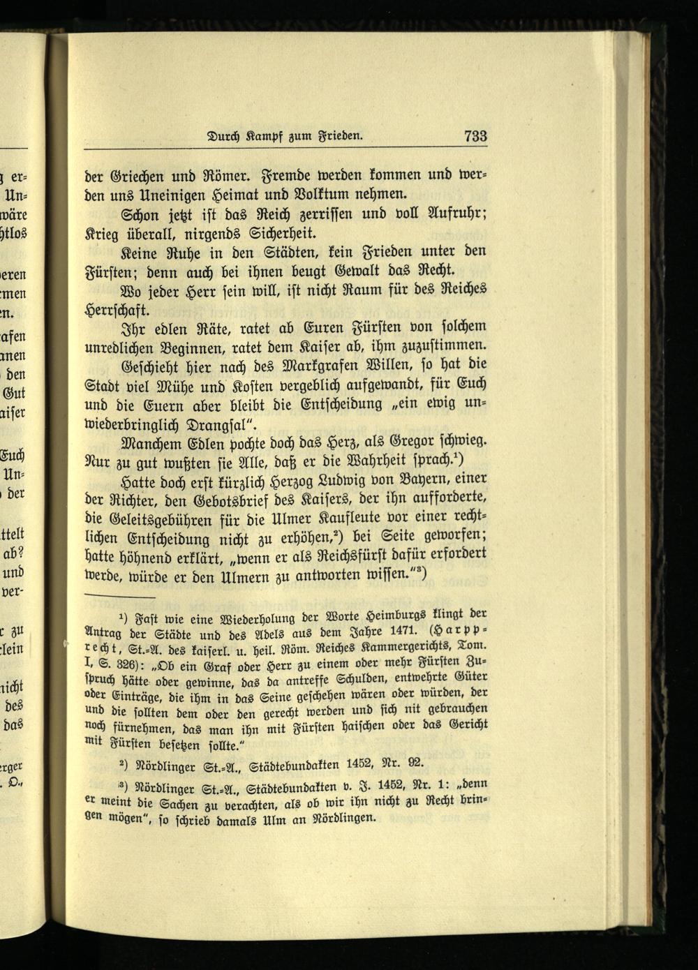 1) Faſt wie eine Wiederholung der Worte Heimburgs klingt der Antrag der Städte und des Adels aus dem Jahre 1471.(Harpprecht, St.⸗A. des kaiſerl. u. heil. Röm. Reiches Kammergerichts, Tom. J. S. 326):„Ob ein Graf oder Herr zu einem oder mehr Fürſten Zuſpruch hätte oder gewinne, das da antreffe Schulden, entwehrte Güter oder Einträge, die ihm in das Seine geſchehen wären oder würden, der und die ſollten dem oder den gerecht werden und ſich nit gebrauchen noch fürnehmen, das man ihn mit Fürſten haiſchen oder das Gericht mit Fürſten beſetzen ſollte.“