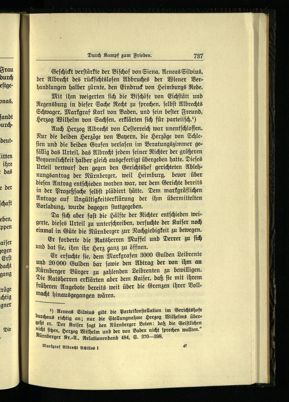 Auch Herzog Albrecht von Oeſterreich war unentſchloſſen. Nur die beiden Herzöge von Bayern , die Herzöge von Schle ſien und die beiden Grafen verlaſen im Beratungszimmer gefällig das Urteil, das Albrecht jedem ſeiner Richter der größeren Bequemlichkeit halber gleich ausgefertigt übergeben hatte. Dieſes Urteil verwarf den gegen den Gerichtshof gerichteten Ablehnungsantrag der Nürnberger , weil Heimburg , bevor über dieſen Antrag entſchieden worden war, vor dem Gerichte bereits in der Prozeßſache ſelbſt plädiert hätte. Dem markgräflichen Antrage auf Ungültigkeitserklärung der ihm übermittelten Vorladung, wurde dagegen ſtattgegeben.