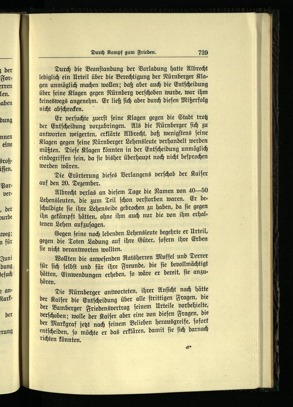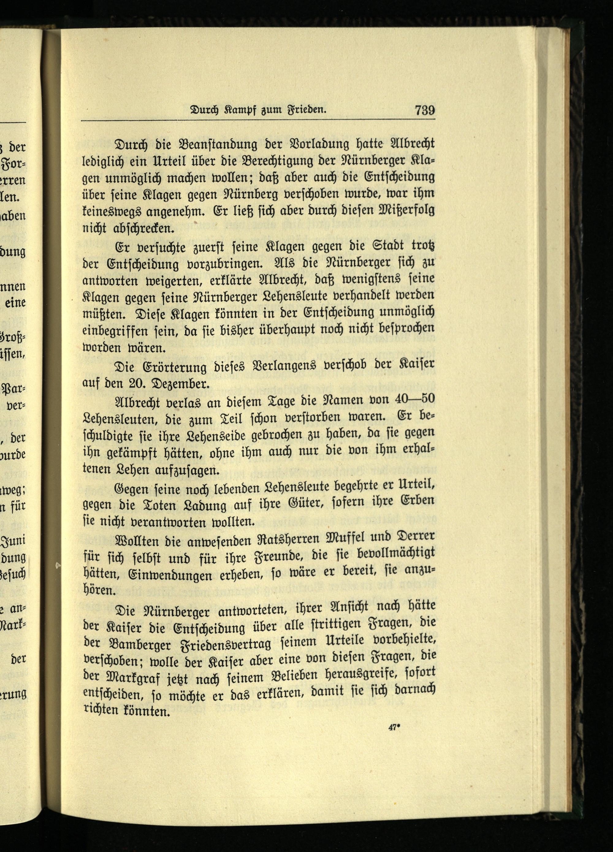 Die Nürnberger antworteten, ihrer Anſicht nach hätte der Kaiſer die Entſcheidung über alle ſtrittigen Fragen, die der Bamberger Friedensvertrag ſeinem Urteile vorbehielte, verſchoben; wolle der Kaiſer aber eine von dieſen Fragen, die der Markgraf jetzt nach ſeinem Belieben herausgreife, ſofort entſcheiden, ſo möchte er das erklären, damit ſie ſich darnach richten könnten.