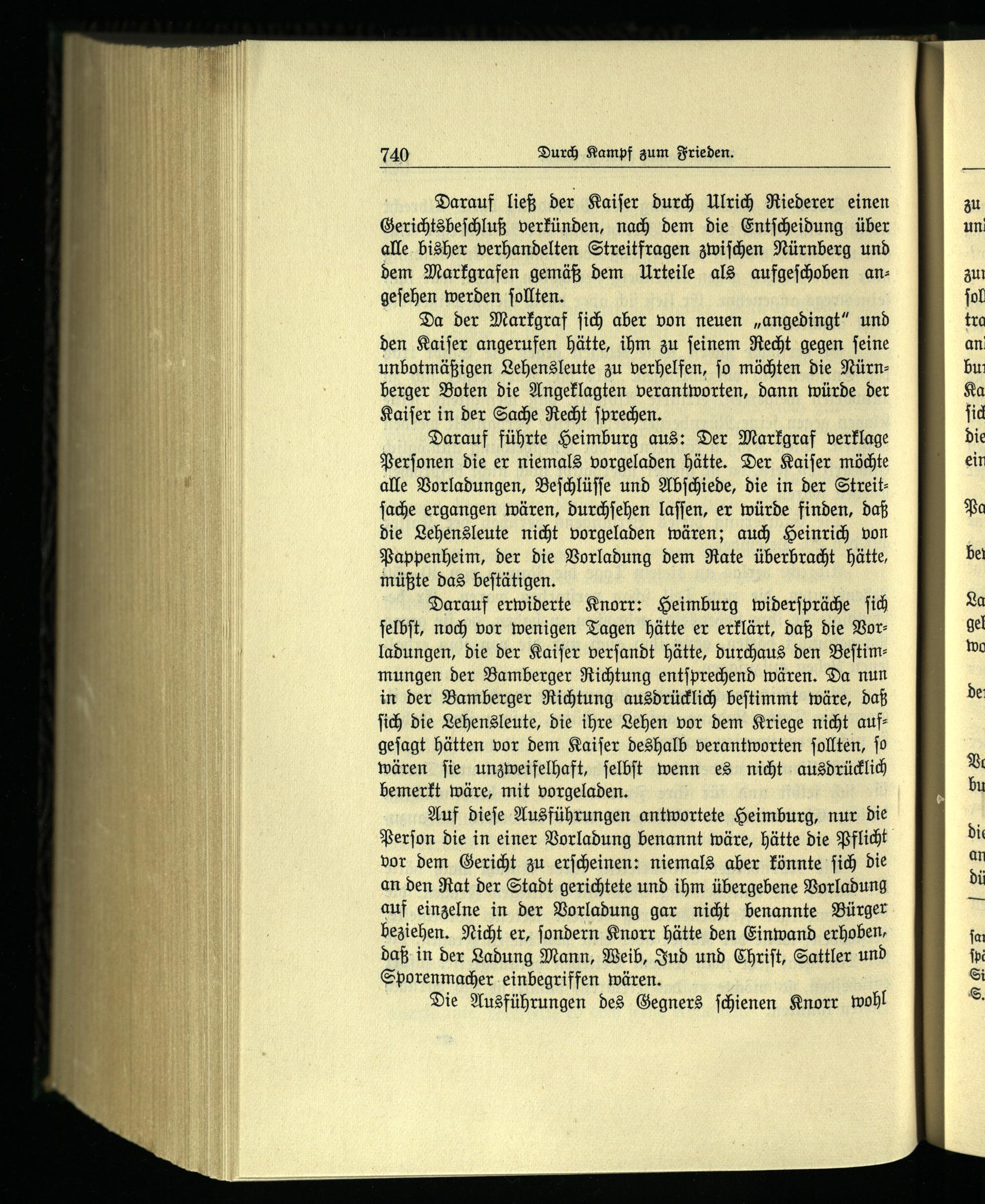 Darauf führte Heimburg aus: Der Markgraf verklage Perſonen die er niemals vorgeladen hätte. Der Kaiſer möchte alle Vorladungen, Beſchlüſſe und Abſchiede, die in der Streitſache ergangen wären, durchſehen laſſen, er würde finden, daß die Lehensleute nicht vorgeladen wären; auch Heinrich von Pappenheim, der die Vorladung dem Rate überbracht hätte, müßte das beſtätigen.