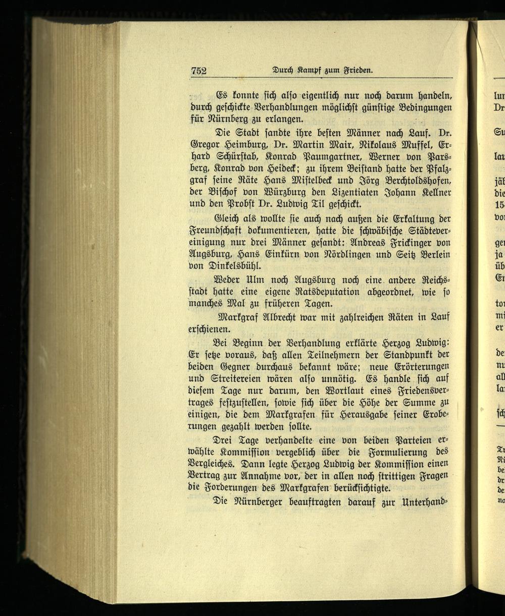 Die Stadt ſandte ihre beſten Männer nach Lauf. Dr. Gregor Heimburg , Dr. Martin Mair, Nikolaus Muffel , Er hard Schürſtab , Konrad Paumgartner, Werner von Parsberg, Konrad von Heideck; zu ihrem Beiſtand hatte der Pfalzgraf ſeine Räte Hans Miſtelbeck und Jörg Berchtoldshofen, der Biſchof von Würzburg den Lizentiaten Johann Kellner und den Probſt Dr. Ludwig Til geſchickt.