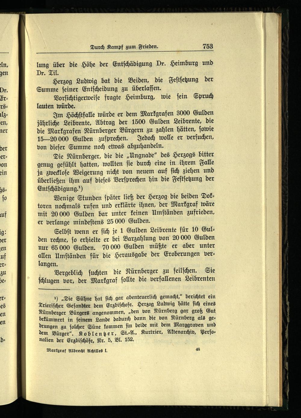 Die Nürnberger , die die„Ungnade“ des Herzogs bitter genug gefühlt hatten, wollten ſie durch eine in ihrem Falle ja zweckloſe Weigerung nicht von neuem auf ſich ziehen und überließen ihm auf dieſes Verſprechen hin die Feſtſetzung der Entſchädigung.“)