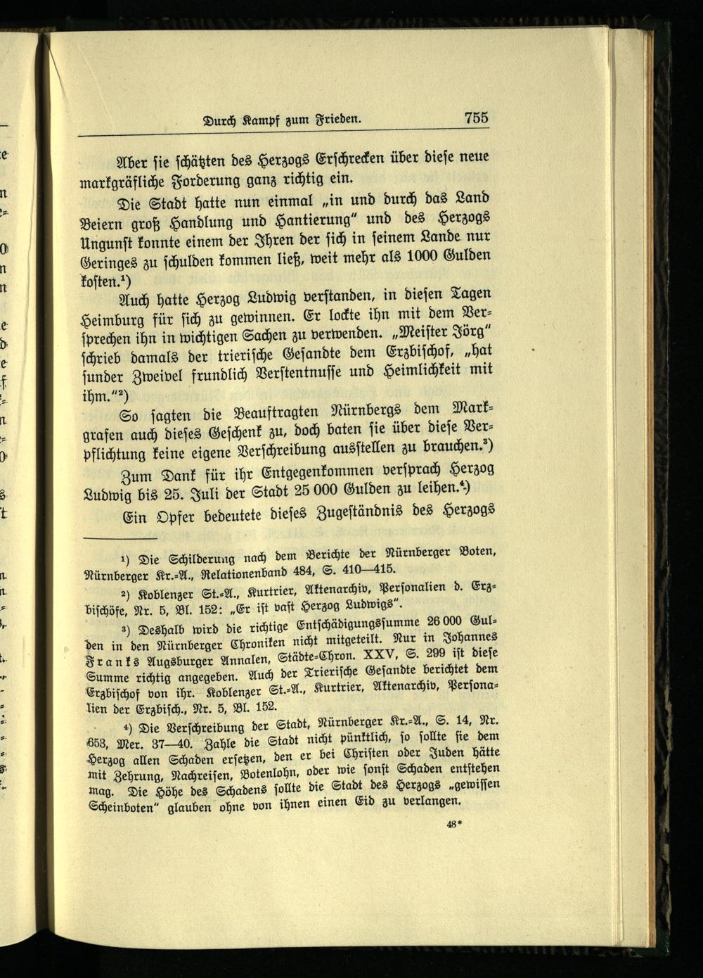 3) Deshalb wird die richtige Entſchädigungsſumme 26 000 Gulden in den Nürnberger Chroniken nicht mitgeteilt. Nur in Johannes Franks Augsburger Annalen, Städte⸗Chron. XXV, S. 299 iſt dieſe Summe richtig angegeben. Auch der Trieriſche Geſandte berichtet dem Erzbiſchof von ihr. Koblenzer St.⸗A., Kurtrier, Aktenarchiv, Perſonalien der Erzbiſch., Nr. 5, Bl. 152.