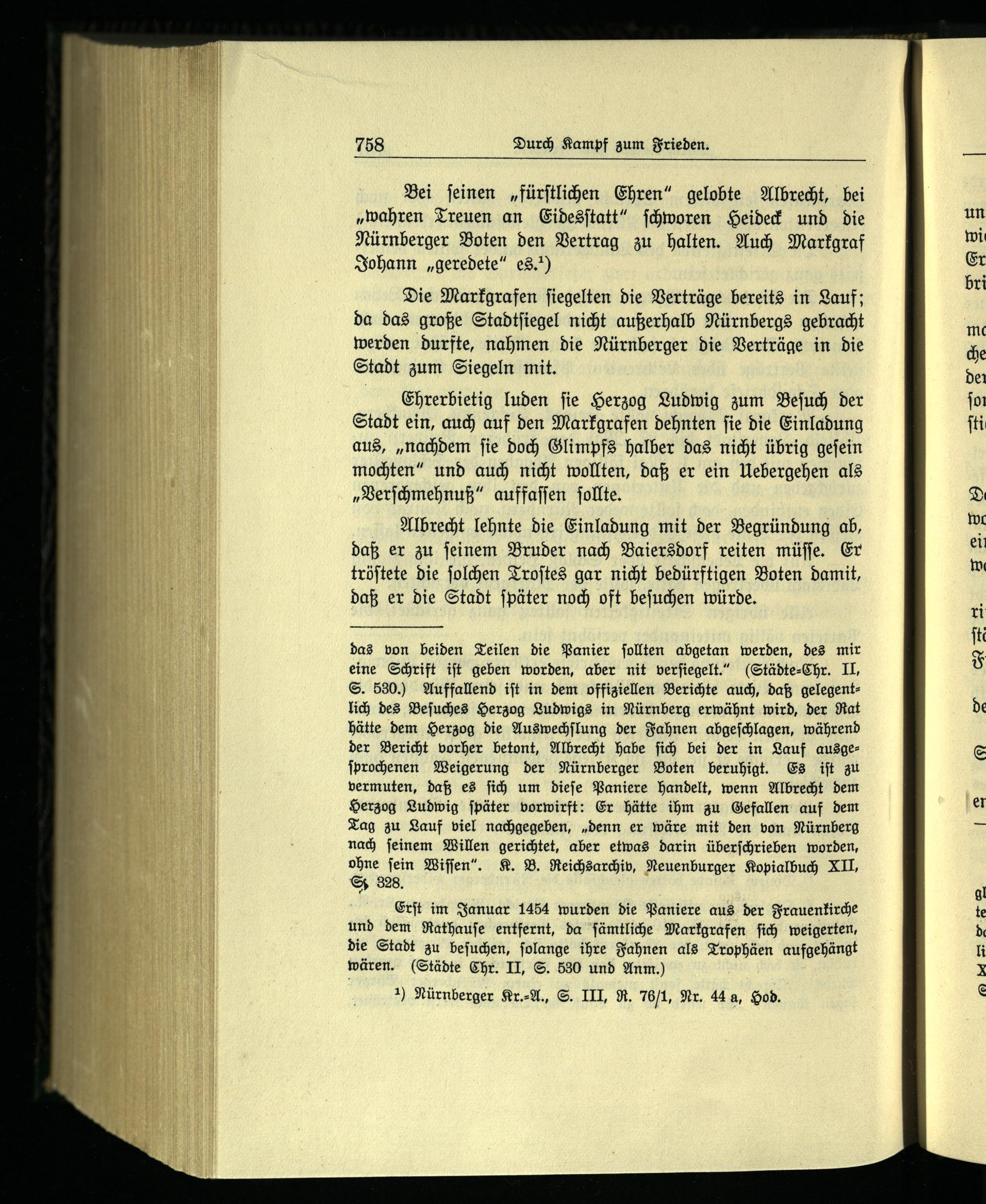Erſt im Januar 1454 wurden die Paniere aus der Frauenkirche und dem Rathauſe entfernt, da ſämtliche Markgrafen ſich weigerten, die Stadt zu beſuchen, ſolange ihre Fahnen als Trophäen aufgehängt wären.(Städte Chr. II, S. 530 und Anm.)