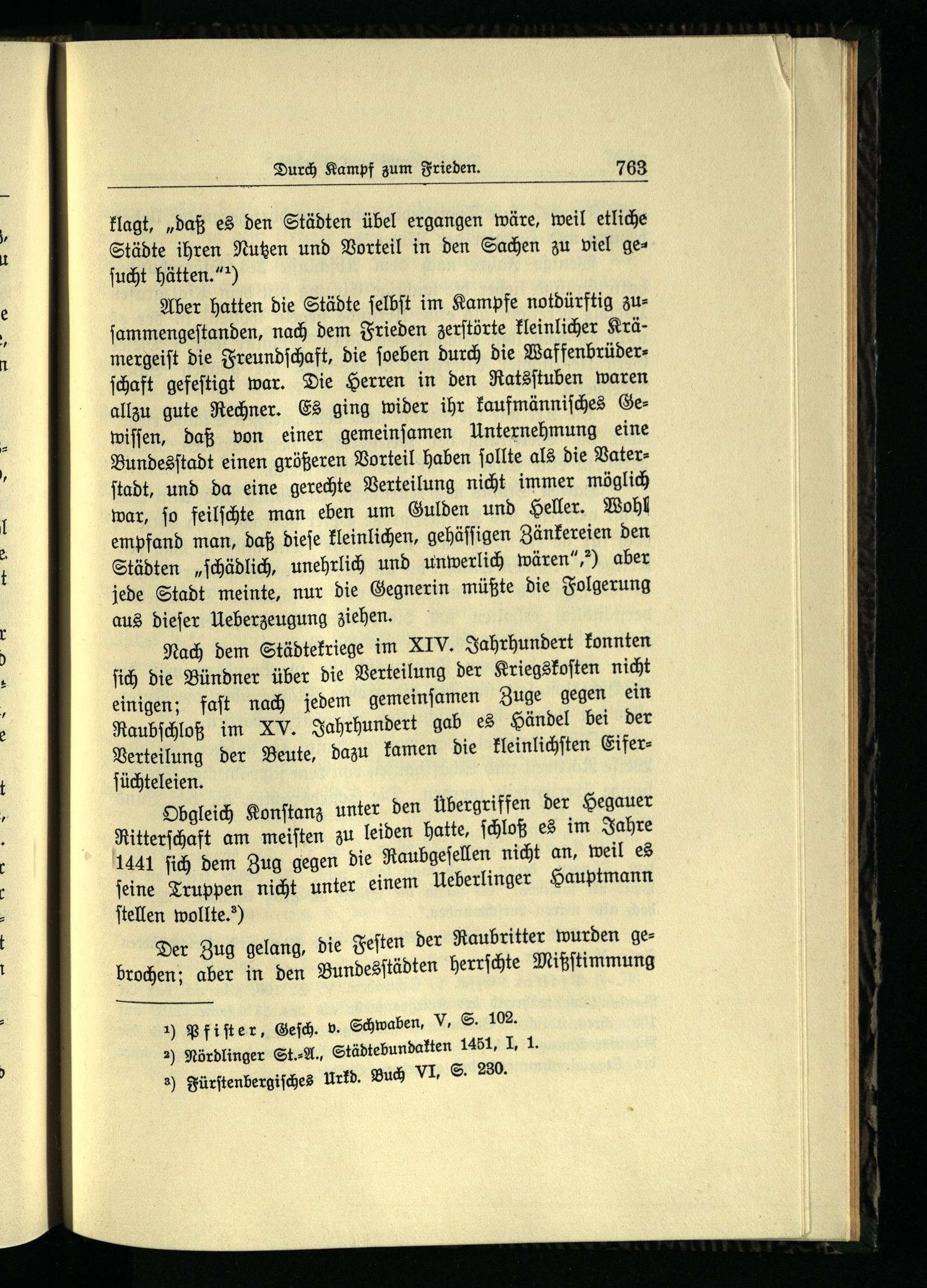 Obgleich Konſtanz unter den Übergriffen der Hegauer Ritterſchaft am meiſten zu leiden hatte, ſchloß es im Jahre 1441 ſich dem Zug gegen die Raubgeſellen nicht an, weil es ſeine Truppen nicht unter einem Ueberlinger Hauptmann ſtellen wollte.“)