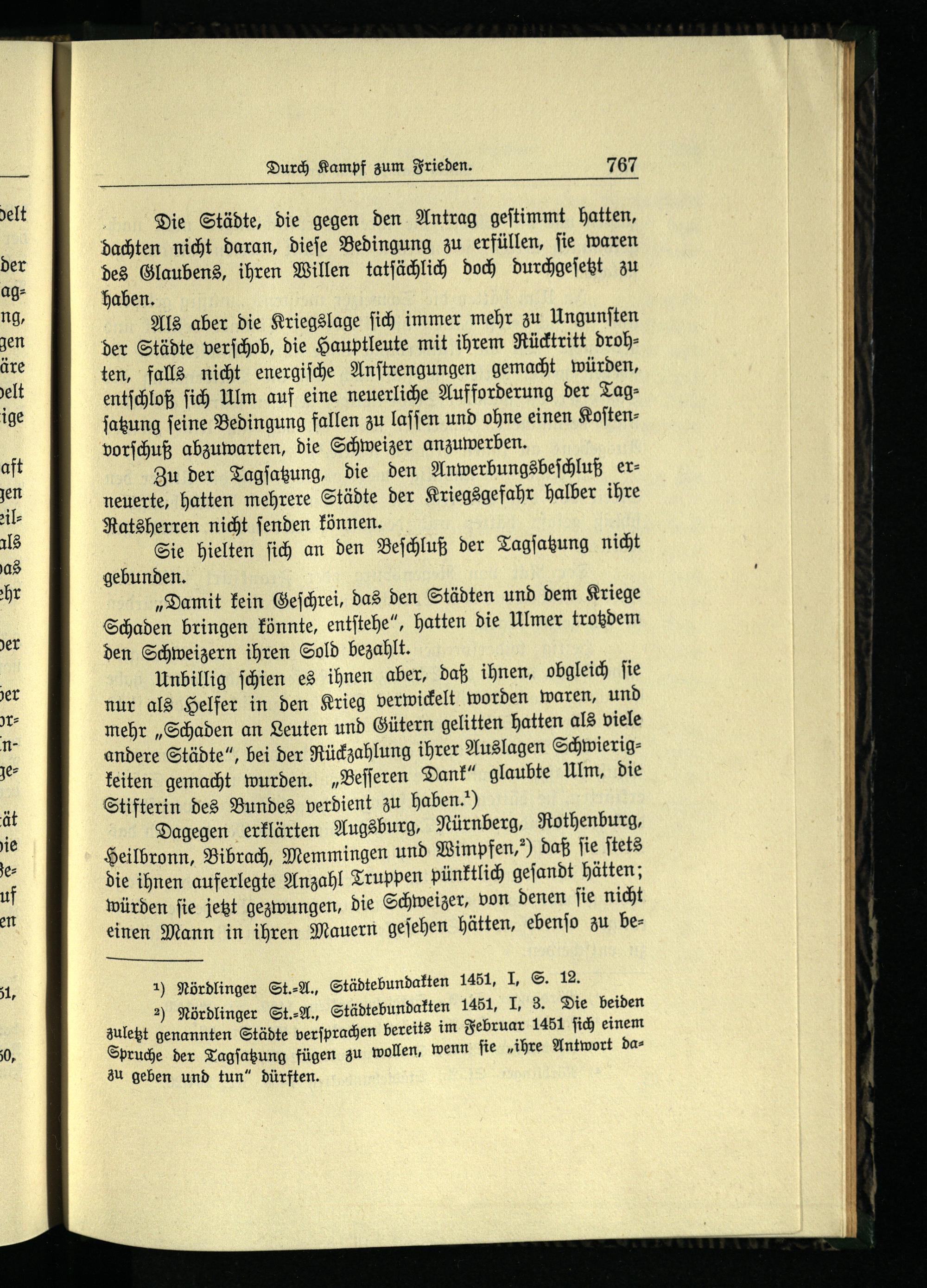 2) Nördlinger St.⸗A., Städtebundakten 1451, I, 8. Die beiden zuletzt genannten Städte verſprachen bereits im Februar 1451 ſich einem Spruche der Tagſatzung fügen zu wollen, wenn ſie„ihre Antwort dazu geben und tun“ dürften.