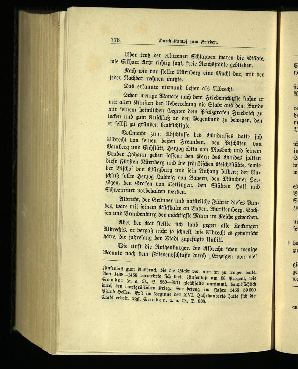 Zinſenlaſt zum Ausdruck, die die Stadt von nun an zu tragen hatte. Von 14381458 vermehrte ſich dieſe Zinſenlaſt um 68 Prozent, wie Sander(a. a. O., S. 850851) gleichfalls annimmt, hauptſächlich durch den markgräflichen Krieg. Sie betrug im Jahre 1458 59 000 Pfund Heller. Erſt im Beginne des XVI. Jahrhunderts hatte ſich die Stadt erholt. Vgl. Sander, a. a. O., S. 888.