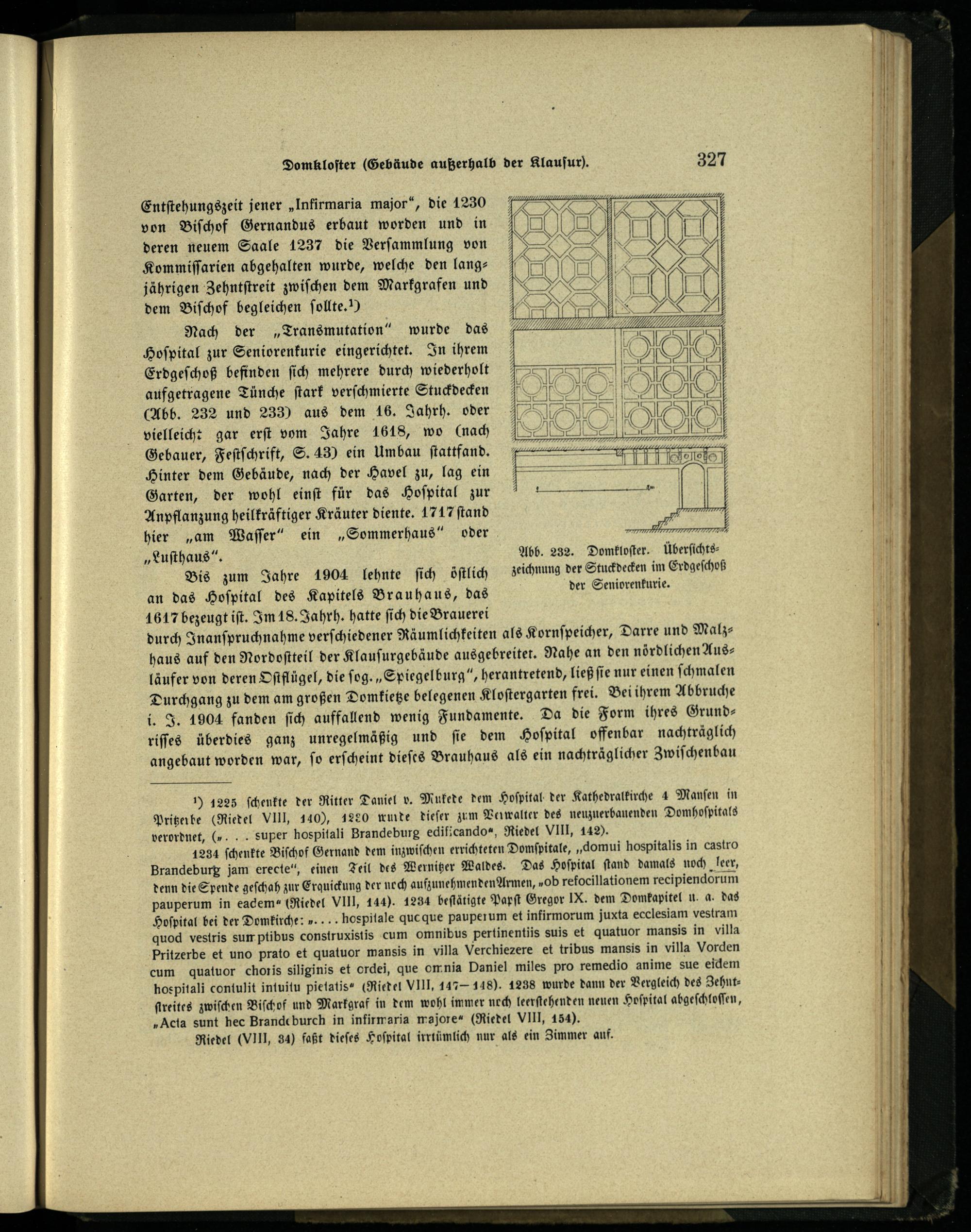 Nach der„Transmutation“ wurde das Hofpital zur Seniorenkurie eingerichtet. In ihrem Erdgeſchoß befinden ſich mehrere durch wiederholt aufgetragene Tünche ſtark verſchmierte Stuckdecken (Abb. 232 und 233) aus dem 16. Jahrh. oder vielleicht gar erſt vom Jahre 1618, wo(nach Gebauer, Feſtſchrift, S. 43) ein Umbau ſtattfand. Hinter dem Gebäude, nach der Havel zu, lag ein Garten, der wohl einſt für das Hoſpital zur Anpflanzung heilkräftiger Kräuter diente. 1717 tand hier„am Waſſer“ ein„Sommerhaus“ oder ö „Luſthaus“. Abb. 282. Domkloſter. Überſichts