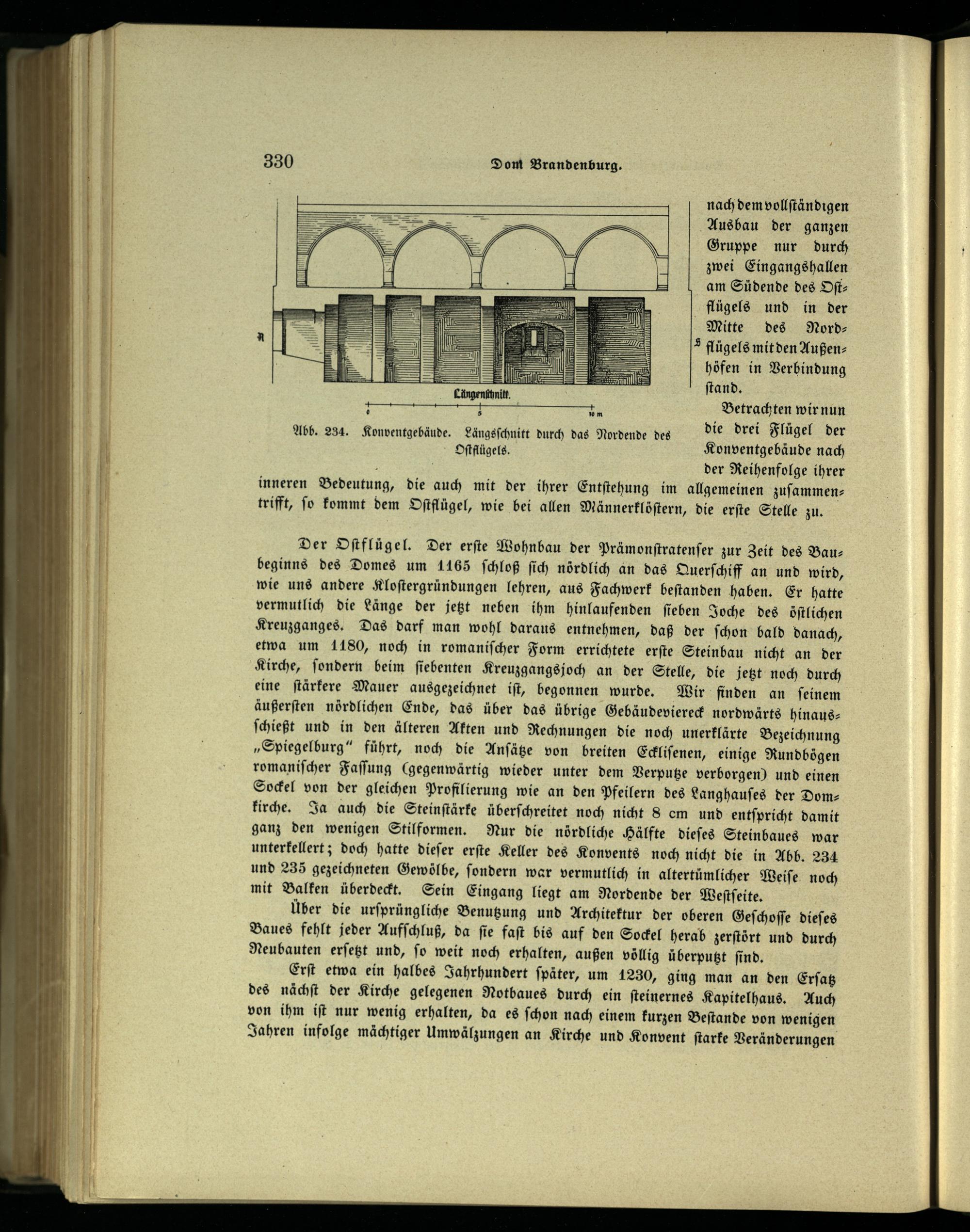 Der Oſtflügel. Der erſte Wohnbau der Prämonſtratenſer zur Zeit des Baubeginns des Domes um 11635 ſchloß ſich nördlich an das Querſchiff an und wird, wie uns andere Kloſtergründungen lehren, aus Fachwerk beſtanden haben. Er hatte vermutlich die Länge der jetzt neben ihm hinlaufenden ſieben Joche des öſtlichen Kreuzganges. Das darf man wohl daraus entnehmen, daß der ſchon bald danach, etwa um 1180, noch in romaniſcher Form errichtete erſte Steinbau nicht an der Kirche, ſondern beim ſiebenten Kreuzgangsjoch an der Stelle, die jetzt noch durch eine ſtärkere Mauer ausgezeichnet iſt, begonnen wurde. Wir finden an ſeinem äußerſten nördlichen Ende, das über das übrige Gebäudeviereck nordwärts hinausſchießt und in den älteren Akten und Rechnungen die noch unerklärte Bezeichnung „Spiegelburg“ führt, noch die Anſätze von breiten Eckliſenen, einige Rundbögen romaniſcher Faſſung(gegenwärtig wieder unter dem Verputze verborgen) und einen Sockel von der gleichen Profilierung wie an den Pfeilern des Langhauſes der Domkirche. Ja auch die Steinſtärke überſchreitet noch nicht 8 em und entſpricht damit ganz den wenigen Stilformen. Nur die nördliche Hälfte dieſes Steinbaues war unterkellert; doch hatte dieſer erſte Keller des Konvents noch nicht die in Abb. 234 und 235 gezeichneten Gewölbe, ſondern war vermutlich in altertümlicher Weiſe noch mit Balken überdeckt. Sein Eingang liegt am Nordende der Weſtſeite.