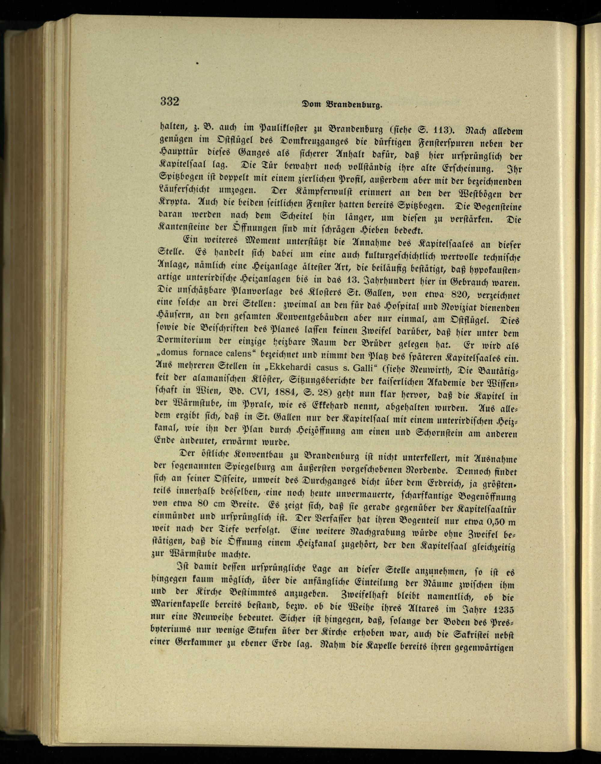 Der öſtliche Konventbau zu Brandenburg iſt nicht unterkellert, mit Ausnahme der ſogenannten Spiegelburg am äußerſten vorgeſchobenen Nordende . Dennoch findet ſich an ſeiner Oſtſeite, unweit des Durchganges dicht über dem Erdreich, ja größten teils innerhalb desſelben, eine noch heute unvermauerte, ſcharfkantige Bogenöffnung von etwa 80 em Breite. Es zeigt ſich, daß ſie gerade gegenüber der Kapitelſaaltür einmündet und urſprünglich iſt. Der Verfaſſer hat ihren Bogenteil nur etwa 0,50 m weit nach der Tiefe verfolgt. Eine weitere Nachgrabung würde ohne Zweifel be— ſtätigen, daß die Offnung einem Heizkanal zugehört, der den Kapitelſaal gleichzeitig zur Wärmſtube machte.