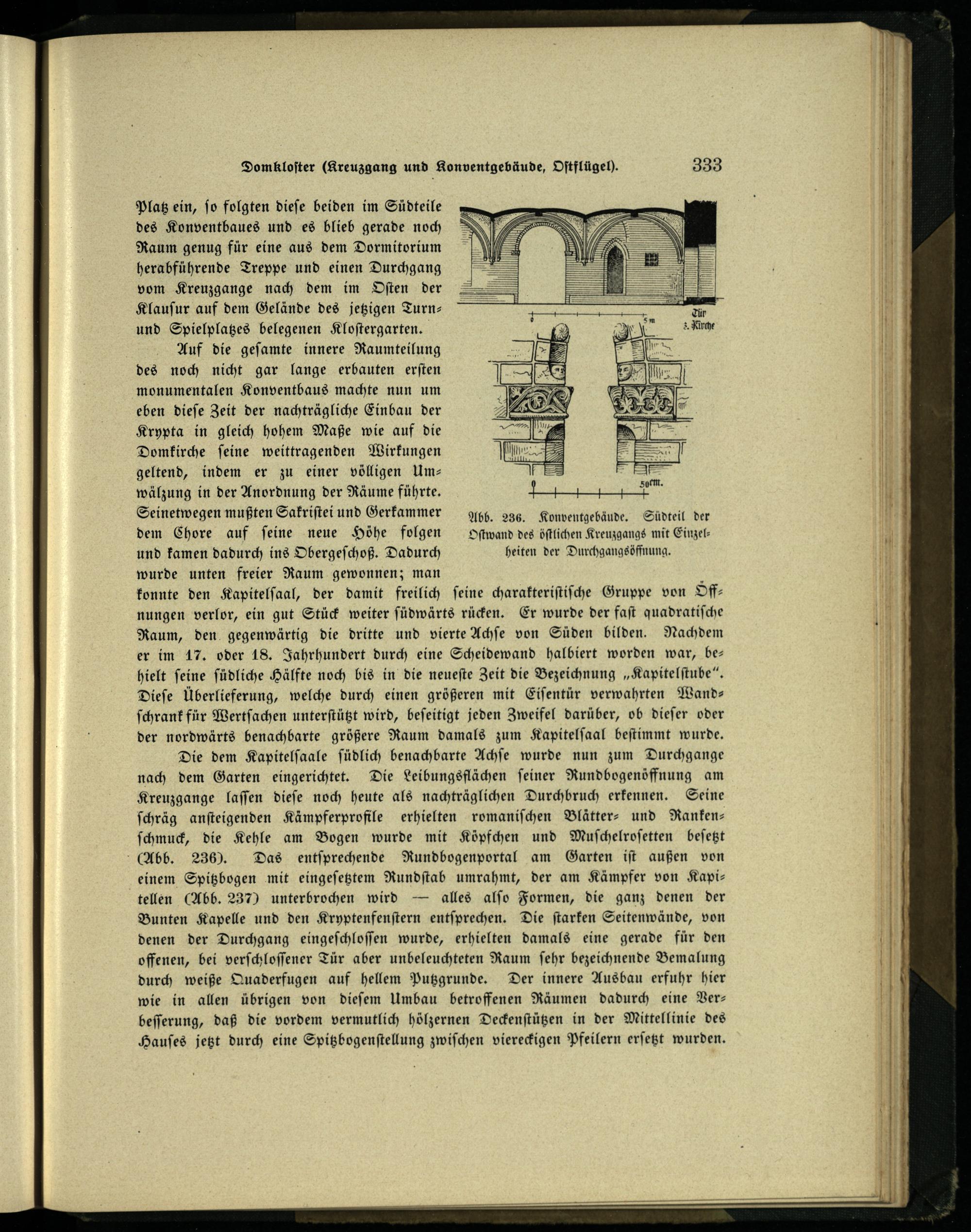 Platz ein, ſo folgten dieſe beiden im Südteile des Konventbaues und es blieb gerade noch Raum genug für eine aus dem Dormitorium herabführende Treppe und einen Durchgang vom Kreuzgange nach dem im Oſten der Klauſur auf dem Gelände des jetzigen Turnund Spielplatzes belegenen Kloſtergarten. Auf die geſamte innere Raumteilung des noch nicht gar lange erbauten erſten monumentalen Konventbaus machte nun um eben dieſe Zeit der nachträgliche Einbau der Krypta in gleich hohem Maße wie auf die Domkirche ſeine weittragenden Wirkungen geltend, indem er zu einer völligen Umwälzung in der Anordnung der Räume führte. Seinetwegen mußten Sakriſtei und Gerkammer Abb. 236. Konventgebäude. Südteil der dem Chore auf ſeine neue Höhe folgen Oſtwand des öſtlichen Kreuzgangs mit Einzelund kamen dadurch ins Obergeſchoß. Dadurch heiten der Durchgangsöffnung. wurde unten freier Raum gewonnen; man konnte den Kapitelſaal, der damit freilich ſeine charakteriſtiſche Gruppe von Sffnungen verlor, ein gut Stück weiter ſüdwärts rücken. Er wurde der faſt quadratiſche Raum, den gegenwärtig die dritte und vierte Achſe von Süden bilden. Nachdem er im 17. oder 18. Jahrhundert durch eine Scheidewand halbiert worden war, behielt feine ſüdliche Hälfte noch bis in die neueſte Zeit die Bezeichnung„Kapitelſtube“. Dieſe Überlieferung, welche durch einen größeren mit Eiſentür verwahrten Wandſchrank für Wertſachen unterſtützt wird, beſeitigt jeden Zweifel darüber, ob dieſer oder der nordwärts benachbarte größere Raum damals zum Kapitelſaal beſtimmt wurde. Die dem Kapitelſaale ſüdlich benachbarte Achſe wurde nun zum Durchgange nach dem Garten eingerichtet. Die Leibungsflächen ſeiner Rundbogenöffnung am Kreuzgange laſſen dieſe noch heute als nachträglichen Durchbruch erkennen. Seine ſchräg anſteigenden Kämpferprofile erhielten romaniſchen Blätter⸗ und Rankenſchmuck, die Kehle am Bogen wurde mit Köpfchen und Muſchelroſetten beſetzt (Abb. 236). Das entſprechende Rundbogenportal am Garten iſt außen von einem Spitzbogen mit eingeſetztem Rundſtab umrahmt, der am Kämpfer von Kapitellen(Abb. 237) unterbrochen wird— alles alſo Formen, die ganz denen der Bunten Kapelle und den Kryptenfenſtern entſprechen. Die ſtarken Seitenwände, von denen der Durchgang eingeſchloſſen wurde, erhielten damals eine gerade für den offenen, bei verſchloſſener Tür aber unbeleuchteten Raum ſehr bezeichnende Bemalung durch weiße Quaderfugen auf hellem Putzgrunde. Der innere Ausbau erfuhr hier wie in allen übrigen von dieſem Umbau betroffenen Räumen dadurch eine Verbeſſerung, daß die vordem vermutlich hölzernen Deckenſtützen in der Mittellinie des Hauſes jetzt durch eine Spitzbogenſtellung zwiſchen viereckigen Pfeilern erſetzt wurden.