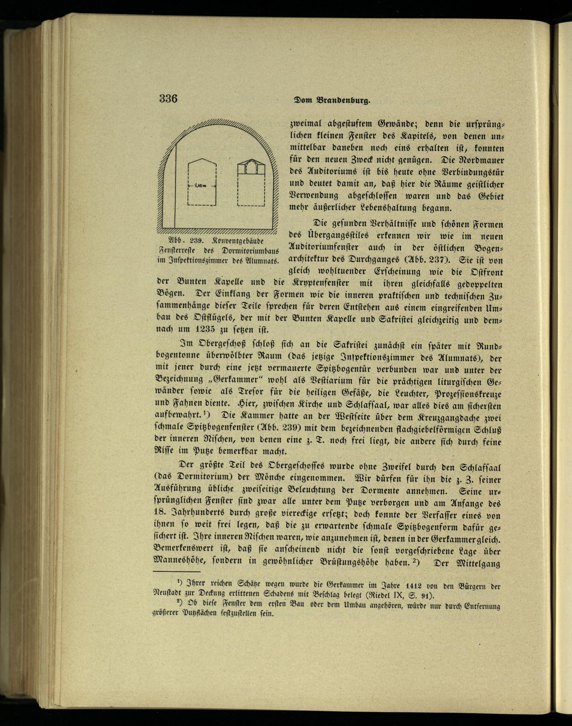 Im Obergeſchoß ſchloß ſich an die Sakriſtei zunächſt ein ſpäter mit Rundbogentonne überwölbter Raum(Das jetzige Inſpektionszimmer des Alumnats), der mit jener durch eine jetzt vermauerte Spitzbogentür verbunden war und unter der Bezeichnung„Gerkammer“ wohl als Veſtiarium für die prächtigen liturgiſchen Gewänder ſowie als Treſor für die heiligen Gefäße, die Leuchter, Prozeſſionskreuze und Fahnen diente. Hier, zwiſchen Kirche und Schlafſaal, war alles dies am ſicherſten aufbewahrt.! Die Kammer hatte an der Weſtſeite über dem Kreuzgangdache zwei ſchmale Spitzbogenfenſter(Abb. 239) mit dem bezeichnenden flachgiebelförmigen Schluß der inneren Niſchen, von denen eine z. T. noch frei liegt, die andere ſich durch feine Riſſe im Putze bemerkbar macht.