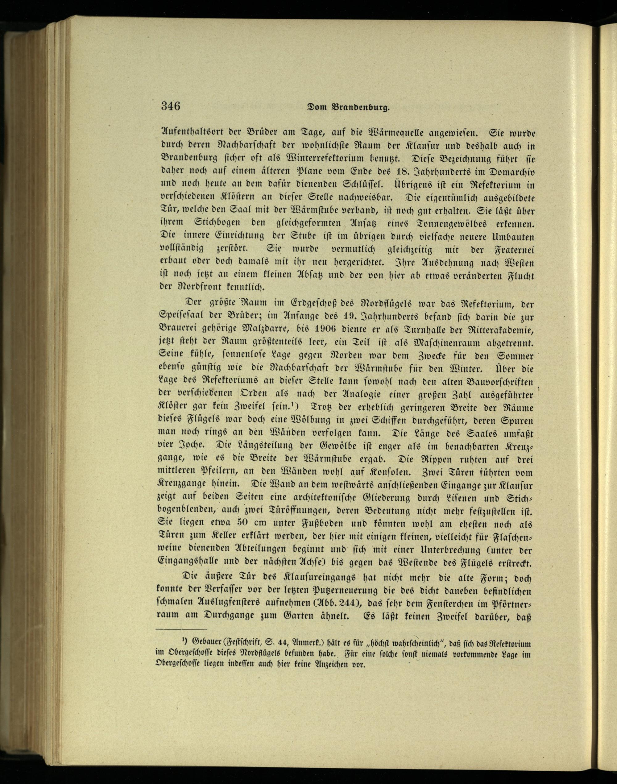 . ) Gebauer(eſtſchrift, S. 44, Anmerk.) hält es für„höchſt wahrſcheinlich“, daß ſich das Refektorium im Obergeſchoſſe dieſes Nordflügels befunden habe. Für eine ſolche ſonſt niemals vorkommende Lage im
