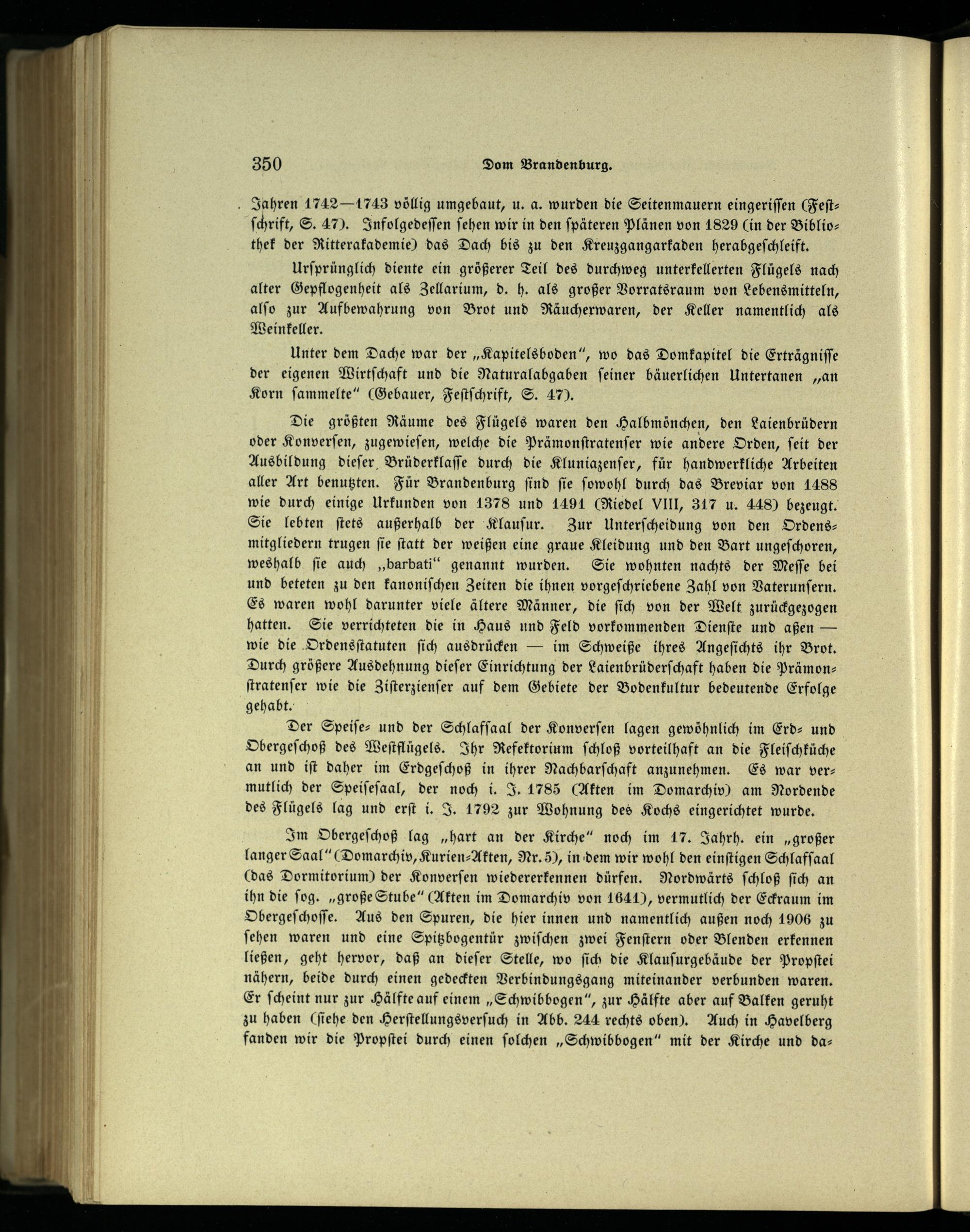 ſchrift, S. 47). Infolgedeſſen ſehen wir in den ſpäteren Plänen von 1829(in der Bibliothek der Ritterakademie) das Dach bis zu den Kreuzgangarkaden herabgeſchleift. Urſprünglich diente ein größerer Teil des durchweg unterkellerten Flügels nach alter Gepflogenheit als Zellarium, d. h. als großer Vorratsraum von Lebensmitteln, alſo zur Aufbewahrung von Brot und Räucherwaren, der Keller namentlich als Weinkeller. Unter dem Dache war der„Kapitelsboden“, wo das Domkapitel die Erträgniſſe